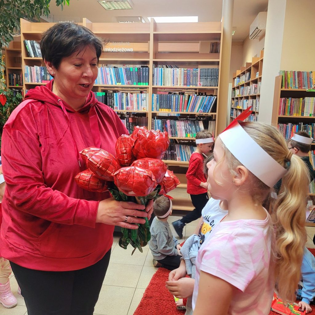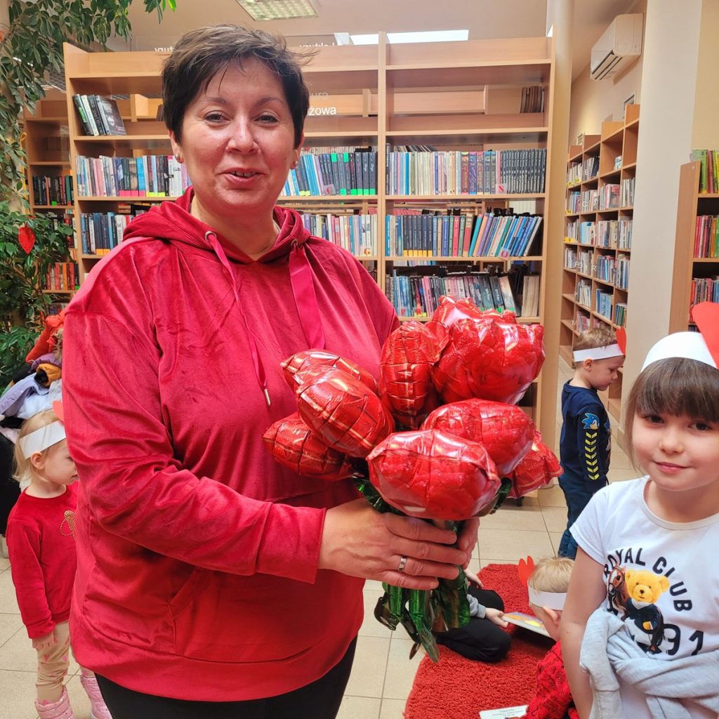 Po czytaniu odbyły się różnorodne quizy i zabawy tematyczne, a także zajęcia plastyczne – kolorowanki związane z tematyką walentynkową. Pani Iwonka wykonała dla dzieci prześliczne serduszkowe opaski. Aby wyrazić naszą wdzięczność za wartościowe spotkanie – dzieci wręczyły bibliotekarce bukiet balonowych kwiatów.