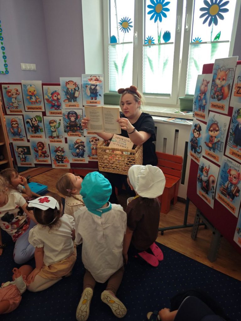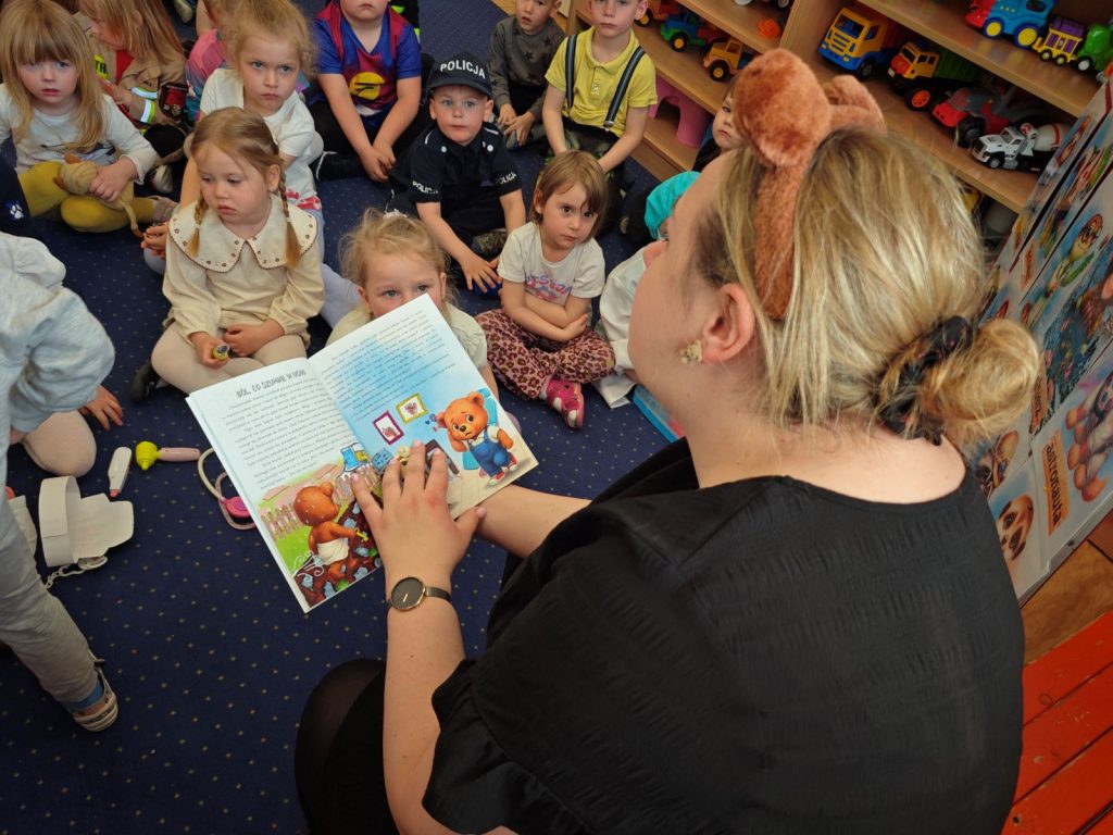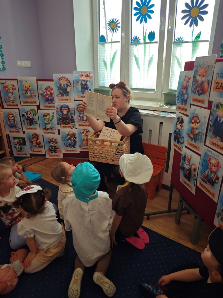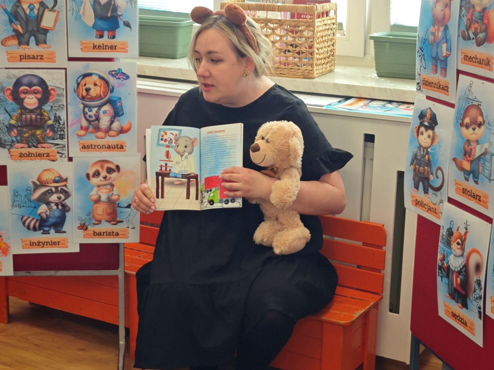 W ramach Narodowego Programu Rozwoju Czytelnictwa odbył się niezwykły „Bajkowy Bal”. 📚🎈 Poznaliśmy sympatycznego Niedźwiadka Władka i z zaciekawieniem wysłuchaliśmy bajki pt. „Ból, co szumiał w uchu”. 🐻📖 Wspólnie rozwiązywaliśmy zagadki i rozmawialiśmy o tym, jak ważna jest praca każdego człowieka – od krawca i sprzedawcy, po lekarza czy strażaka. 🔍👔
