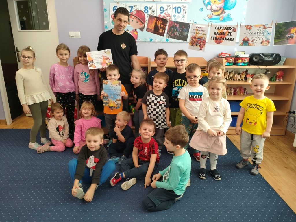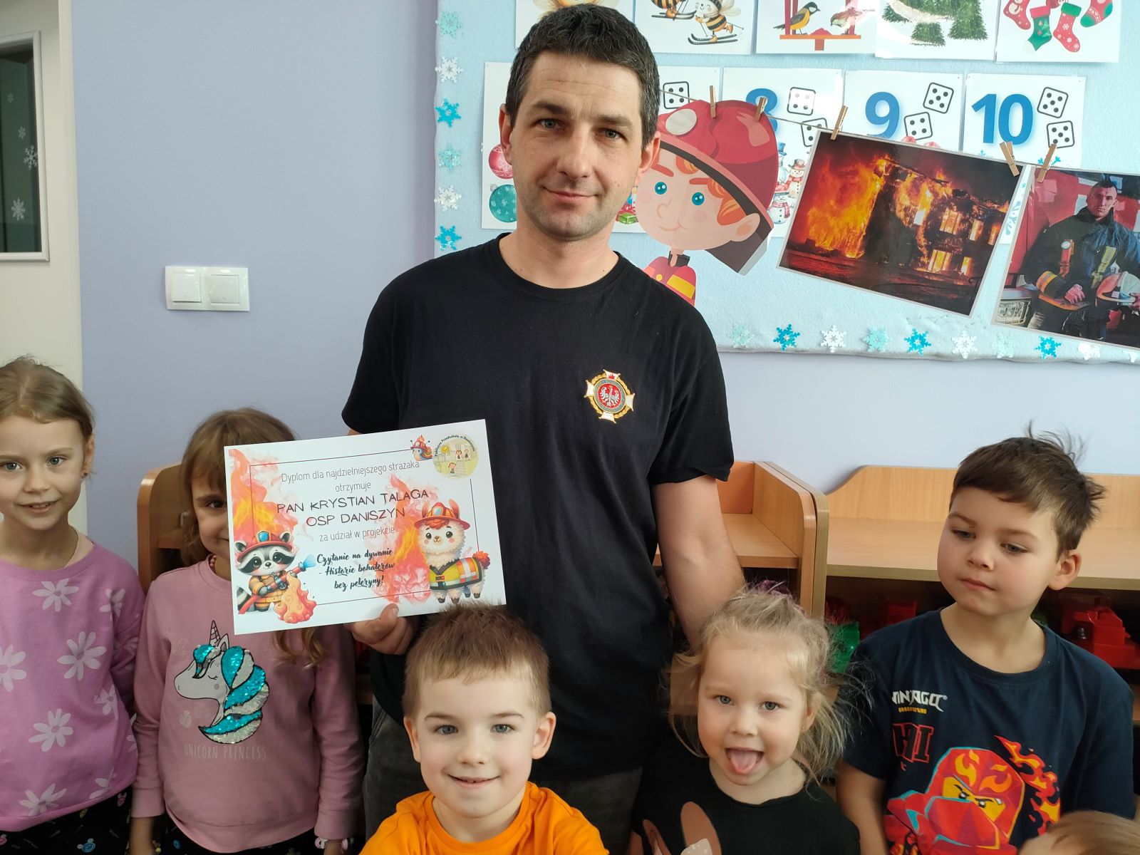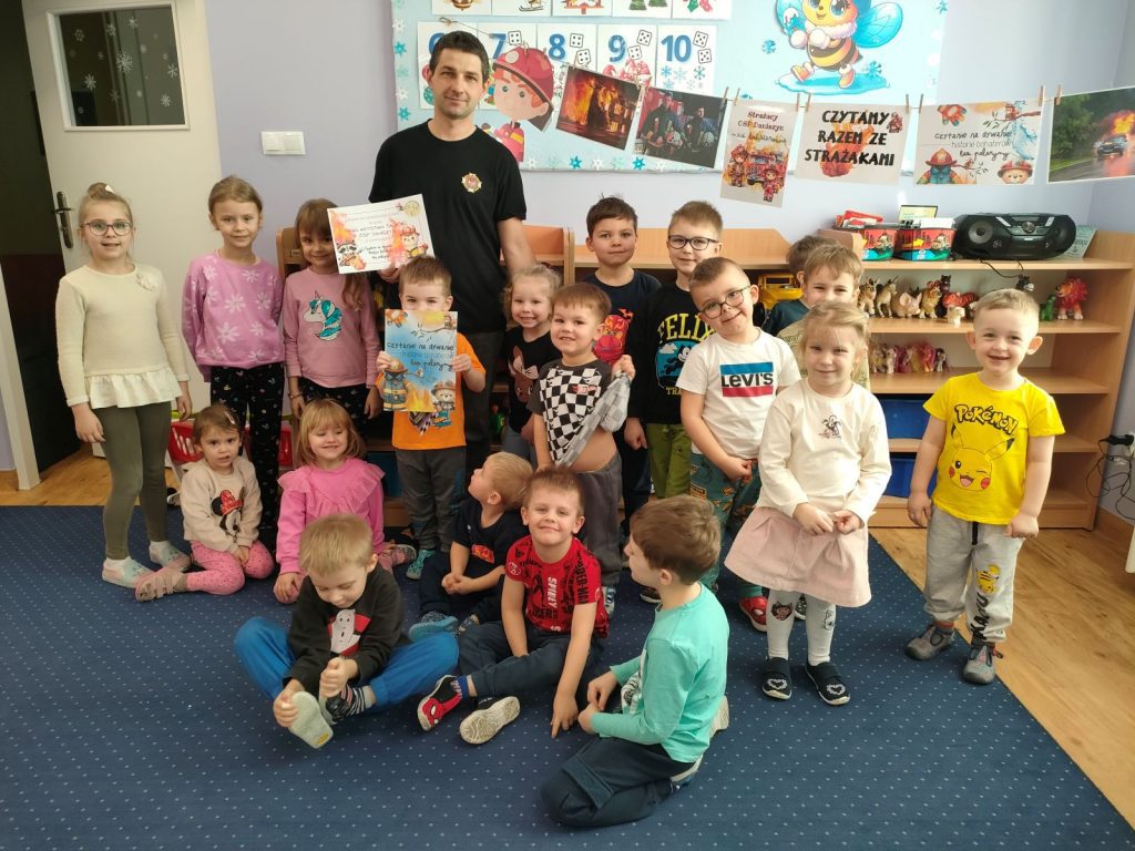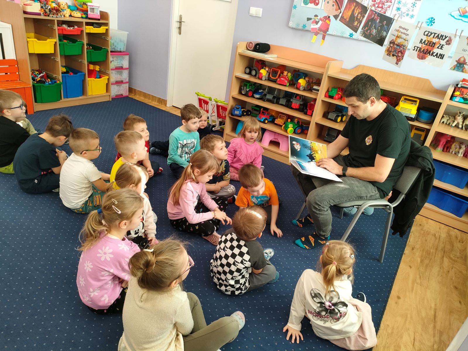 Dziś odbyło się kolejne inspirujące spotkanie w ramach projektu „Czytanie na dywanie – historie bohaterów bez peleryny”. Tym razem mieliśmy przyjemność gościć Pana Krystiana, który z pasją i zaangażowaniem wprowadził nas w dalsze losy bohaterów z książki autorstwa Pani Mai Buczek. Pan Krystian Talaga to nie tylko strażak z Ochotniczej Straży Pożarnej w Daniszynie oraz OSP Cegły, ale również dumny tata naszego Antosia. Jego doświadczenia i poświęcenie w pracy strażaka czynią go prawdziwym bohaterem bez peleryny. Podczas spotkania Pan Krystian przeczytał nam fascynującą historię Sowy Magdaleny i jej nocnego patrolu. Opowieść ta przyciągnęła uwagę wszystkich słuchaczy, którzy z zaciekawieniem śledzili przygody mądrej sowy. Dzieci były zachwycone, mogąc zanurzyć się w świat przygód i mądrości. Kolejną opowieścią była historia Krystyny i Henryka, którzy okazali wsparcie Grecji w trudnych chwilach. Ich zaangażowanie i pomoc to piękny przykład solidarności i odwagi, które inspirują do działania na rzecz innych. Na zakończenie spotkania Pan Krystian przygotował dla wszystkich uczestników słodką niespodziankę. Cukierki podarowane przez niego były miłym akcentem, który dodatkowo umilił całe wydarzenie.👨🚒👨🚒