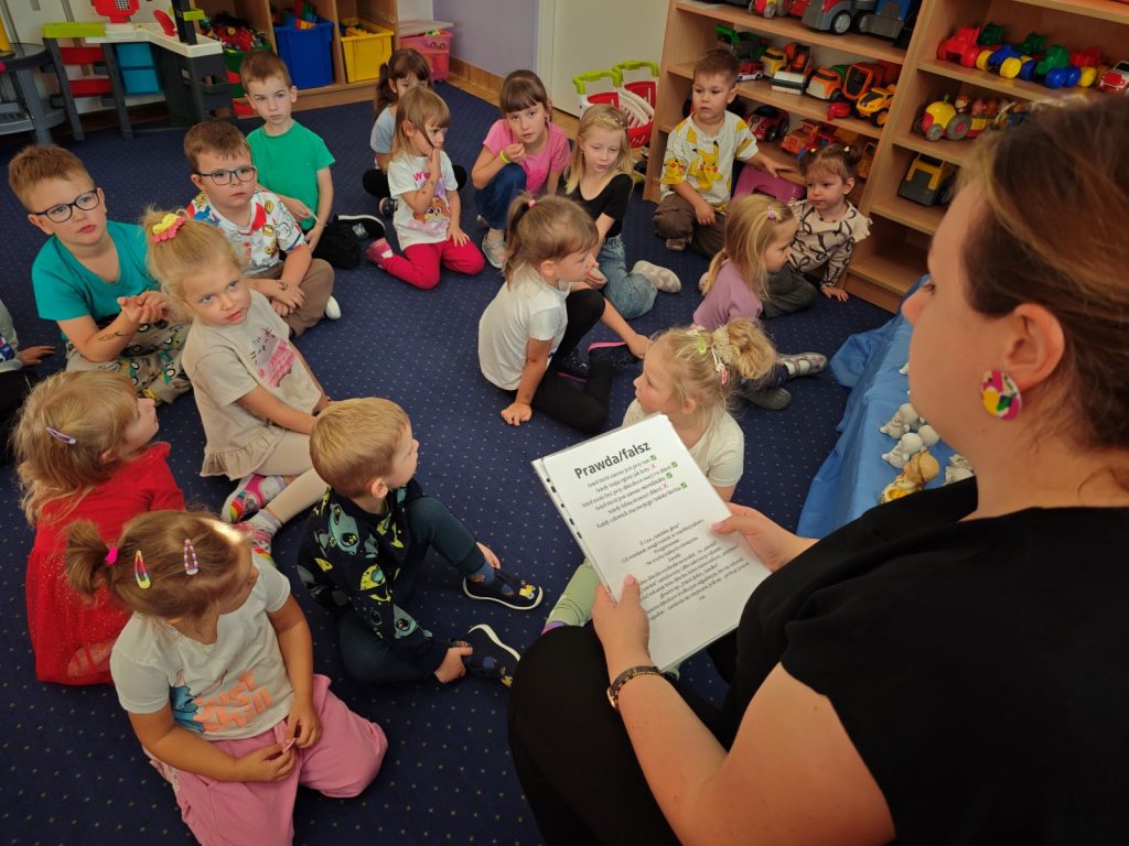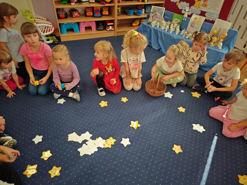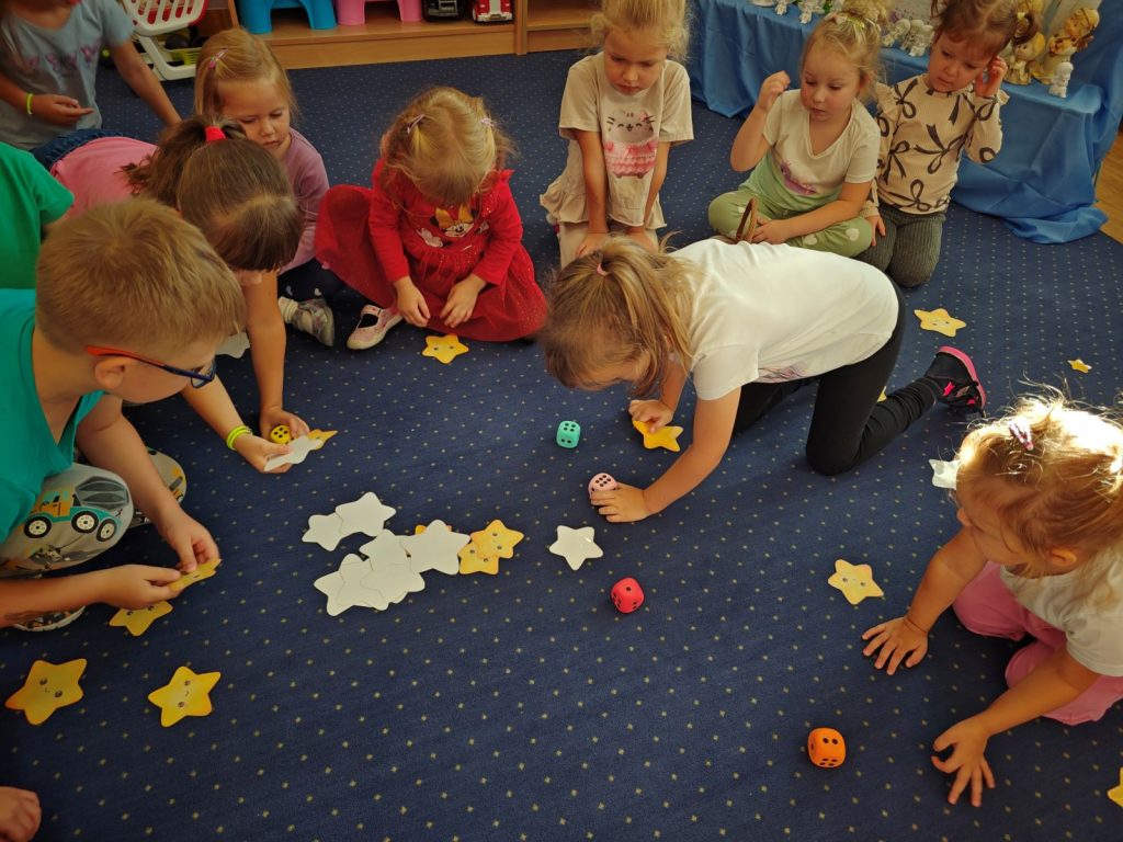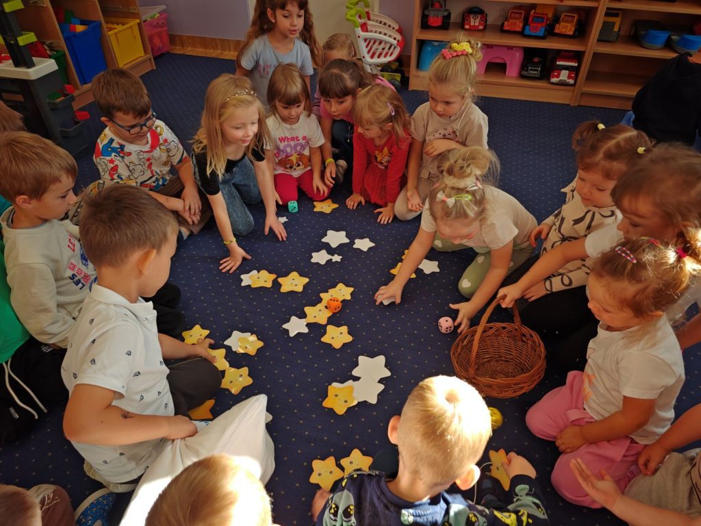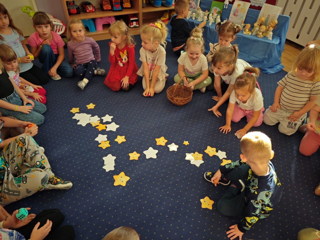 Po opowieści przyszła pora na wspólną zabawę 🎲 – dzieci z radością brały udział w grze „Prawda czy fałsz” 🤔✅❌. Następnie zbierały do koszyczka gwiazdki ⭐⭐, które później razem liczyliśmy – było przy tym mnóstwo radości i emocji!