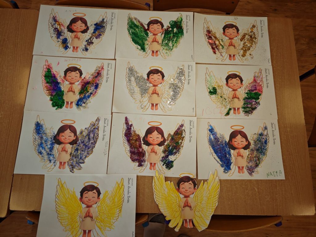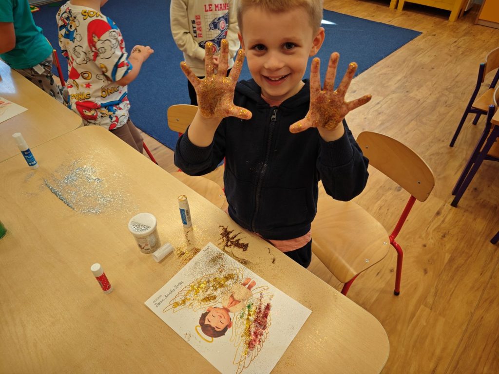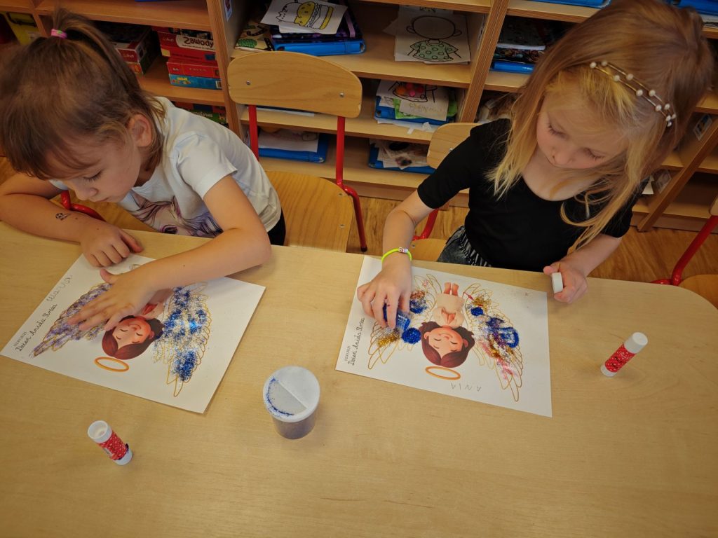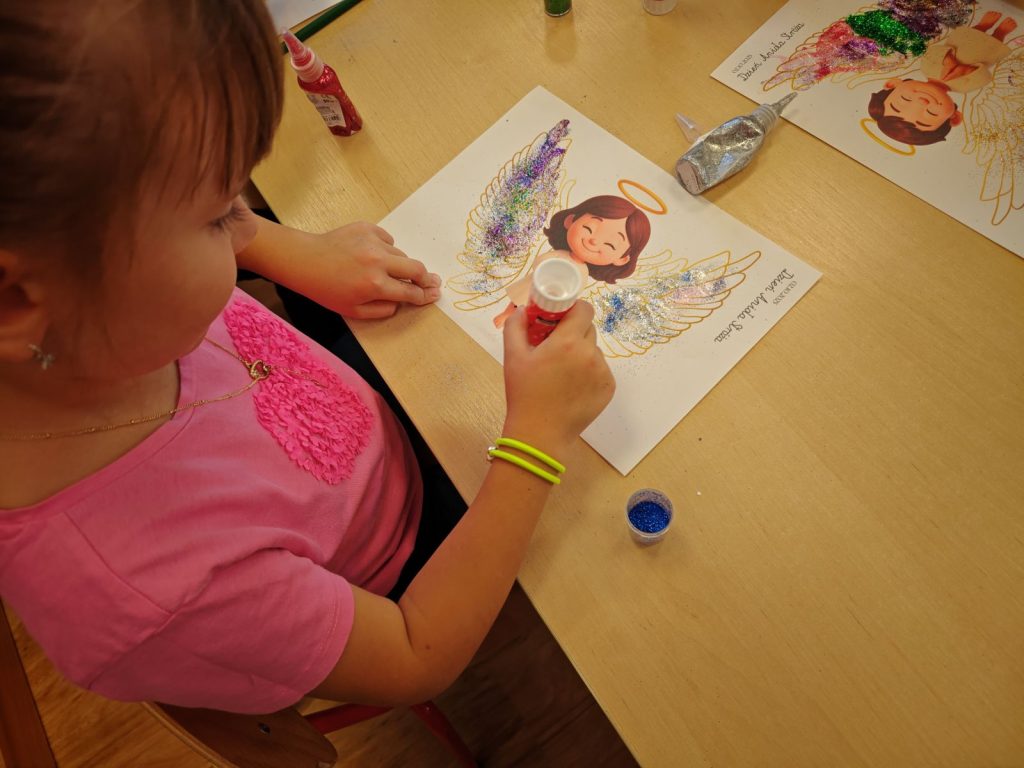 🌟 tworzyliśmy prace plastyczne 🎨 – dzieci ozdabiały skrzydełka aniołków brokatem ✨🪽, a starszaki dodatkowo malowały i dekorowały aniołki z gipsu 🖌️👼