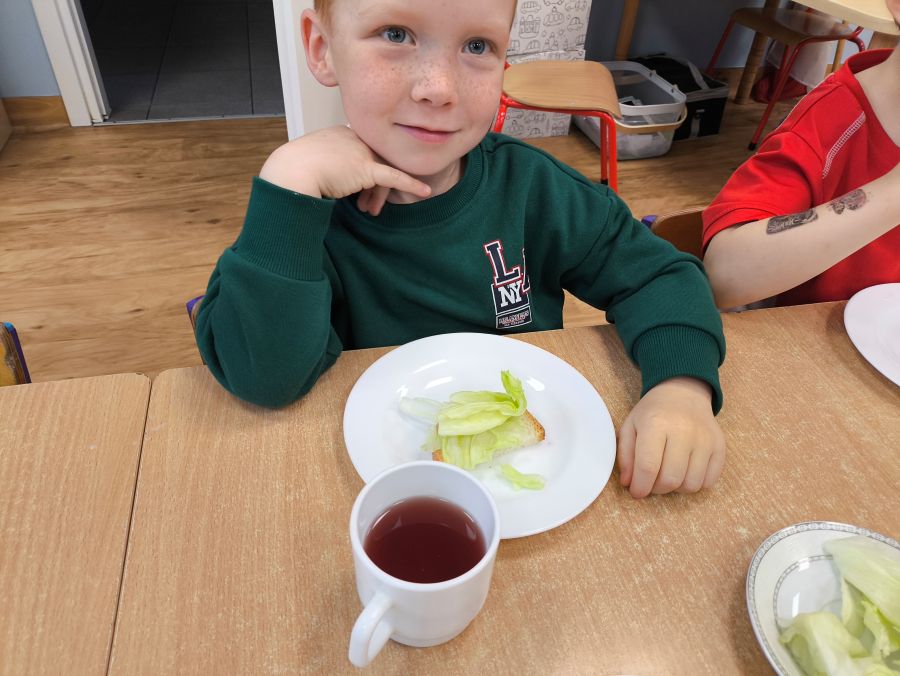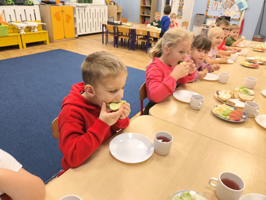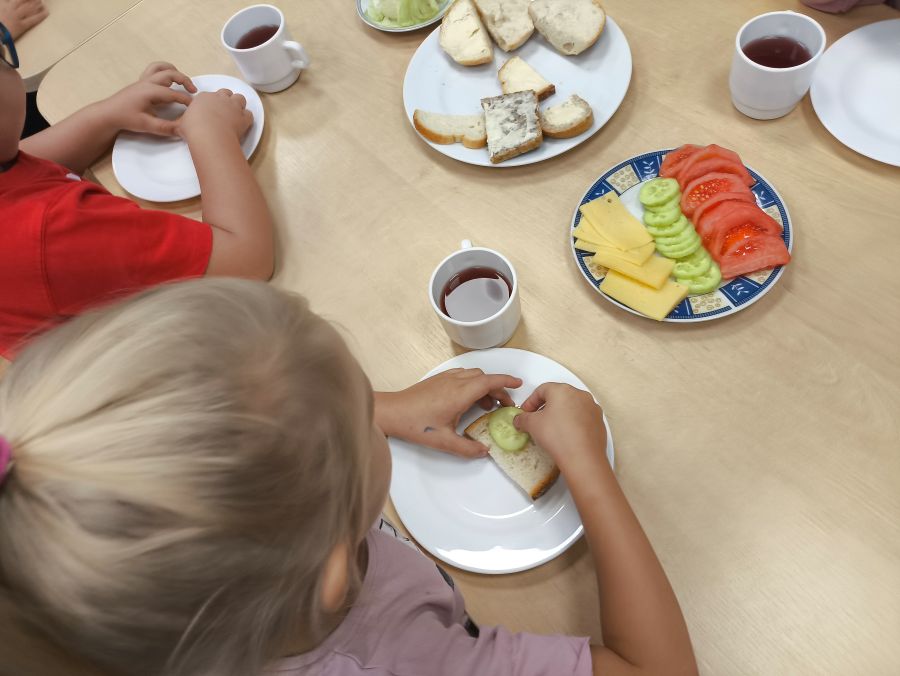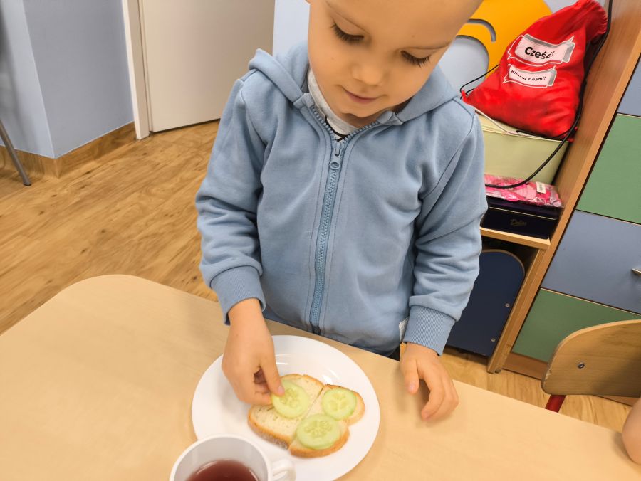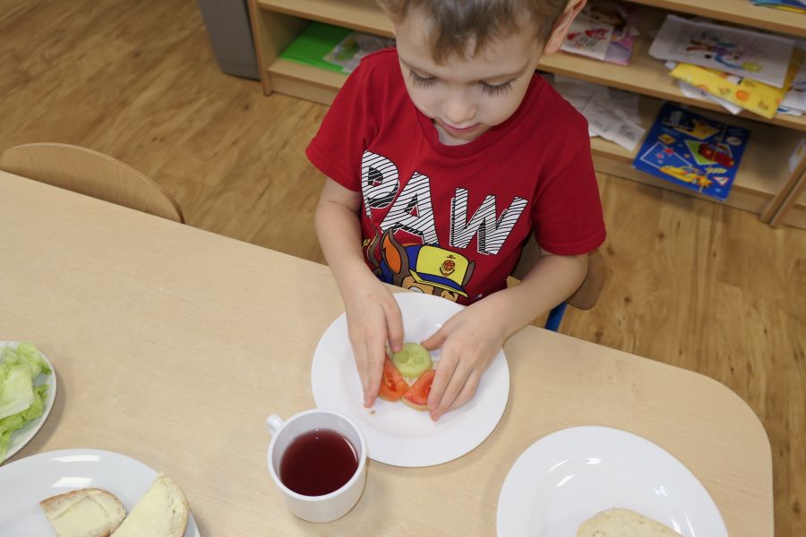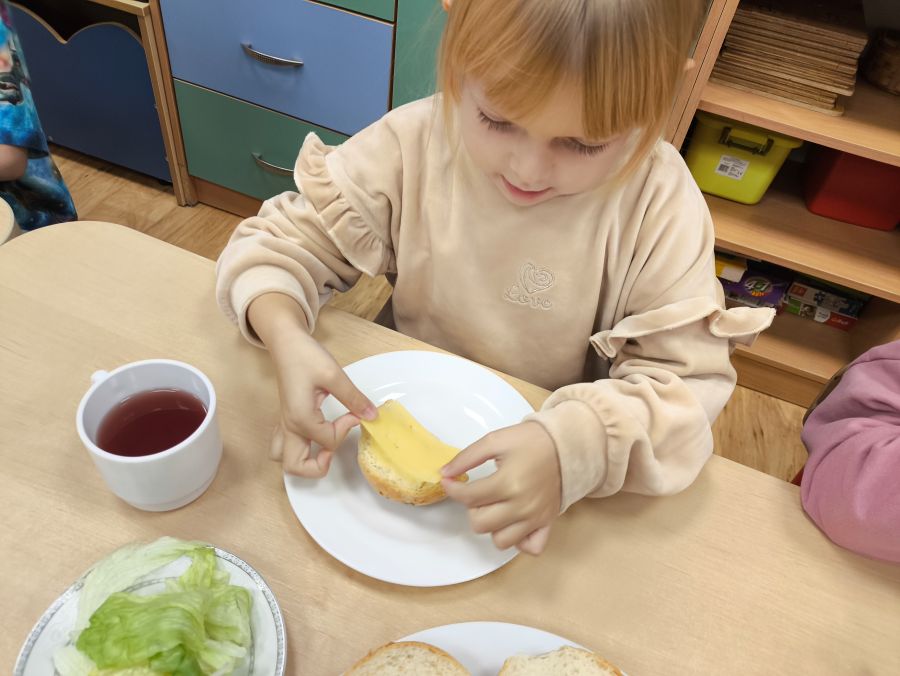 Każde dziecko miało okazję samodzielnie przygotować swoją kanapkę, wybierając spośród takich składników jak ser żółty, sałata, pomidor i ogórek zielony. W sali unosił się zapach świeżych warzyw, a uśmiechy dzieci mówiły same za siebie 😋