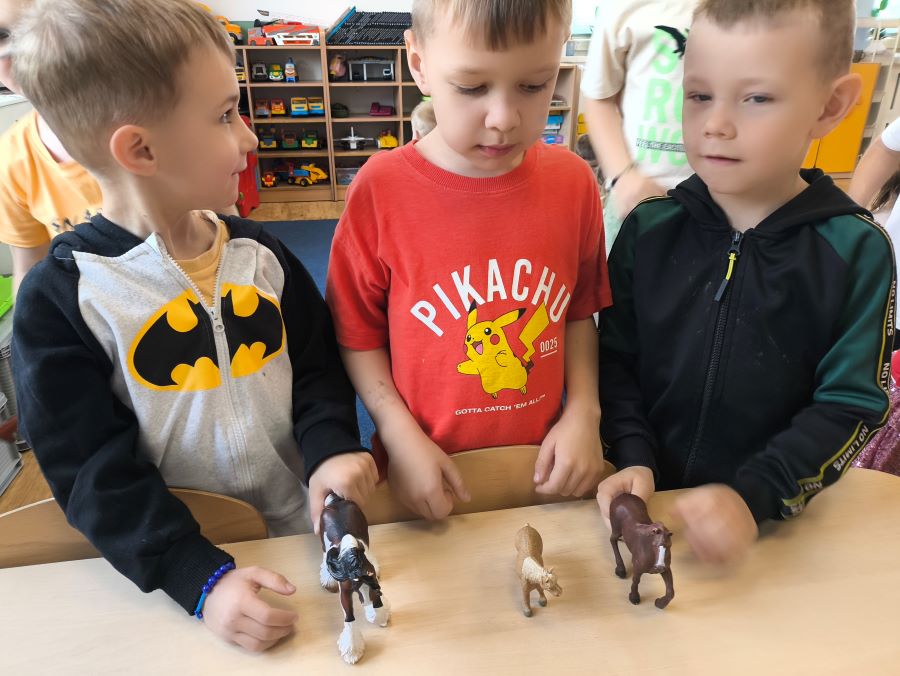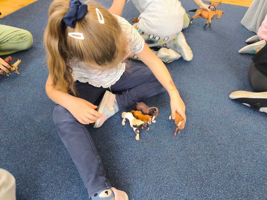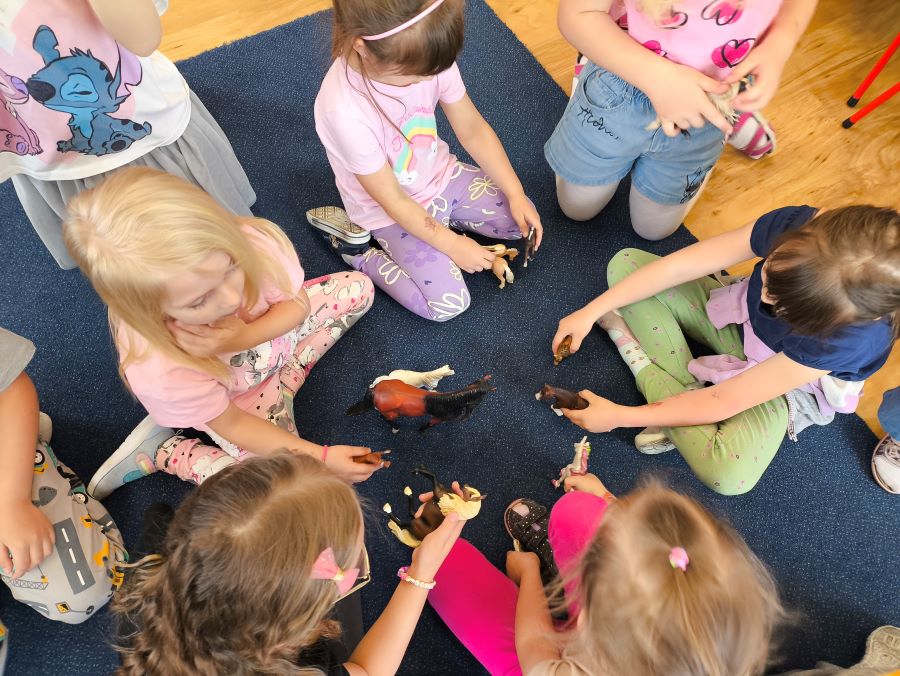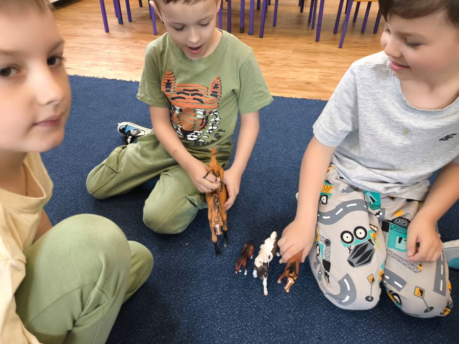 Ogromną radość sprawiły wszystkim koniki przyniesione przez Ulkę – piękne figurki, którymi dzieci mogły się bawić, odgrywać scenki i porównywać je z obrazkami z książek 🐎🎠. To była świetna okazja do rozwijania spostrzegawczości i wzbogacenia słownictwa.