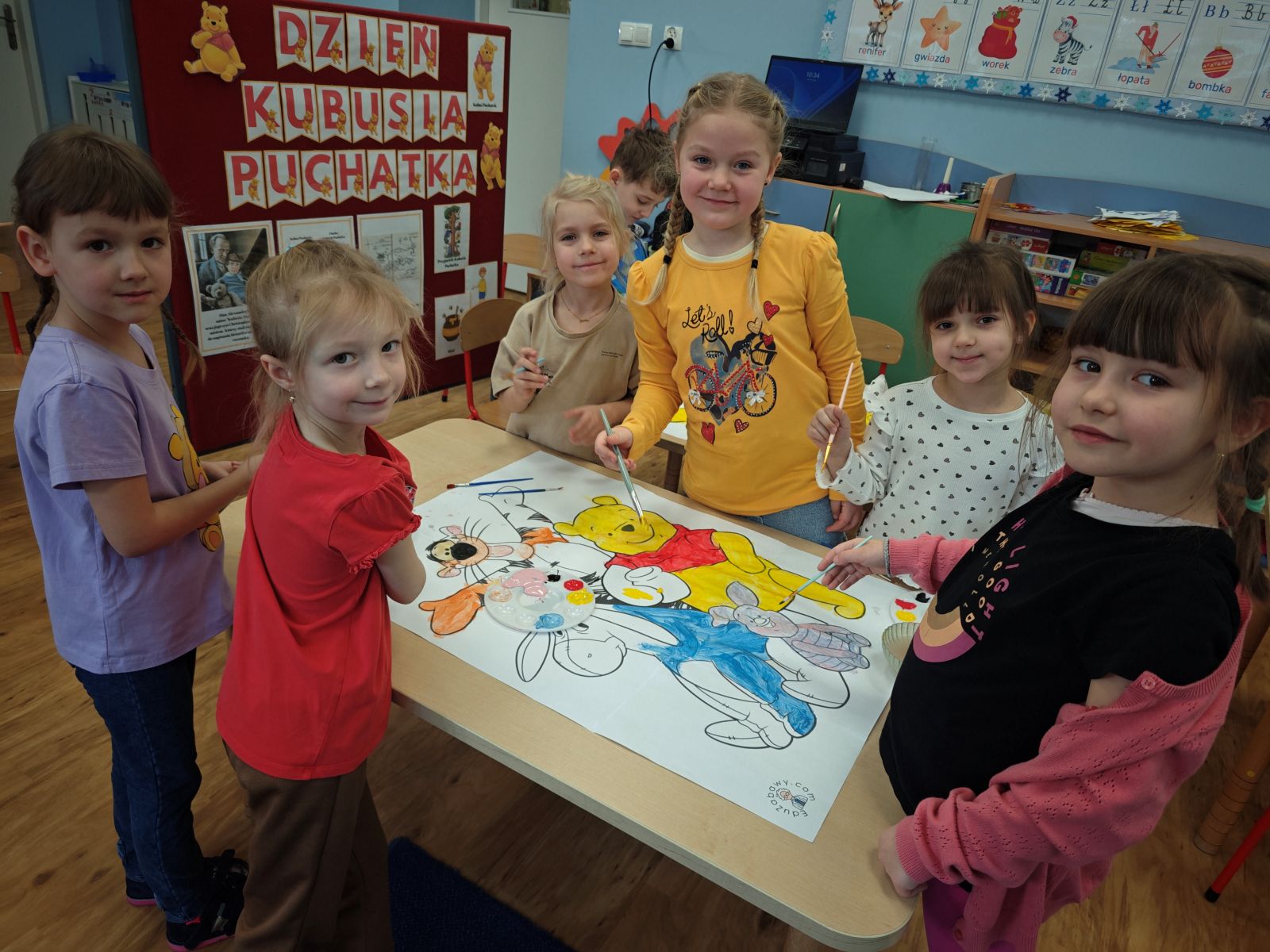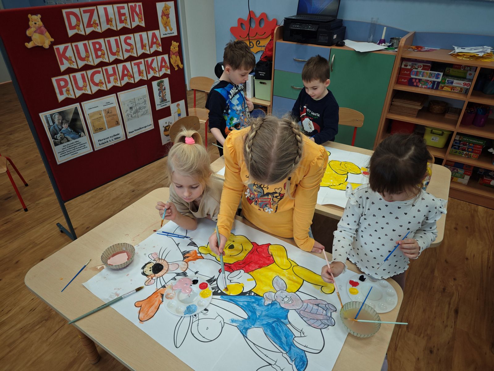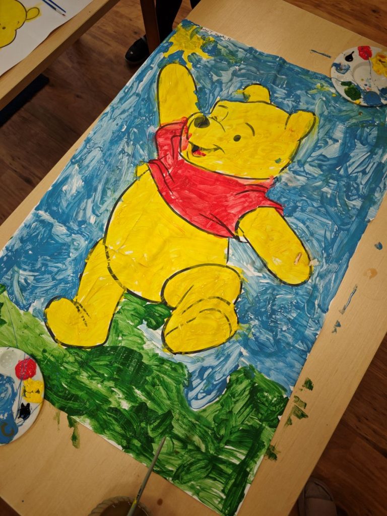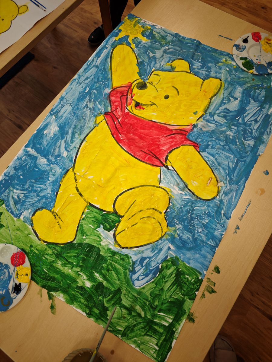 Na zakończenie tego magicznego dnia nasze małe przedszkolaki zamieniły się w artystów. 👩🎨👨🎨 Za pomocą pędzli i farb wyczarowały przepiękne portrety Kubusia Puchatka. Powstała cała galeria uśmiechniętych misiów, które teraz zdobią naszą salę! 🎨💛