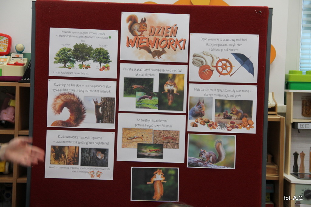 Przedszkolaki dowiedziały się, jakie są cechy charakterystyczne wiewiórek, gdzie najczęściej można je spotkać oraz co najbardziej lubią chrupać. Dzieci z zaciekawieniem słuchały opowieści o ich sprycie, zwinności i niezwykłych umiejętnościach. Podczas zajęć Pani Maja zdradziła kilka fascynujących faktów o wiewiórkach, m.in.: