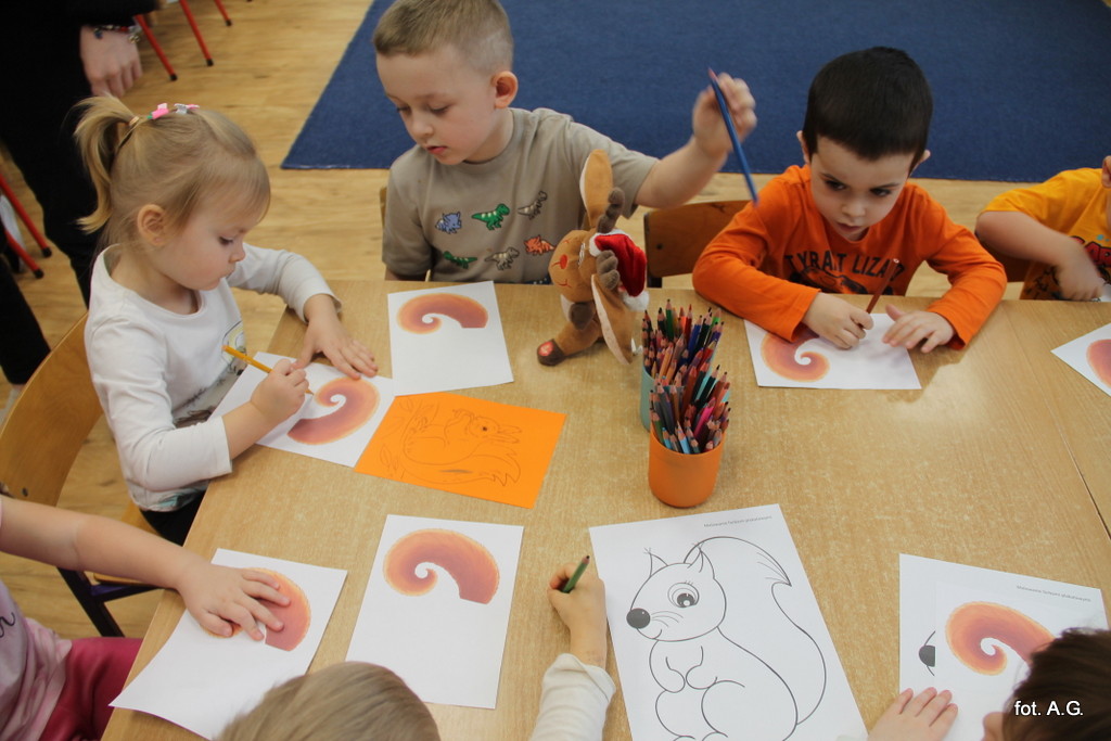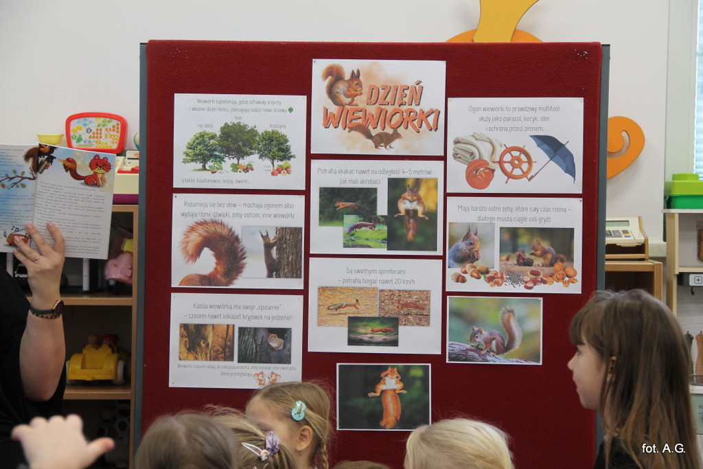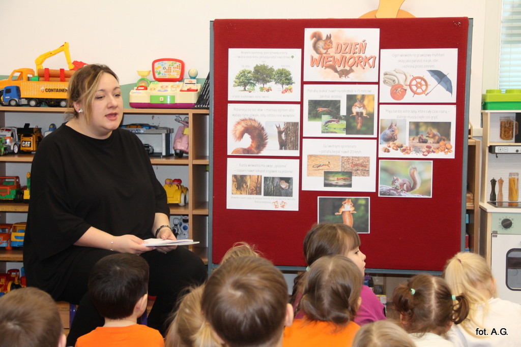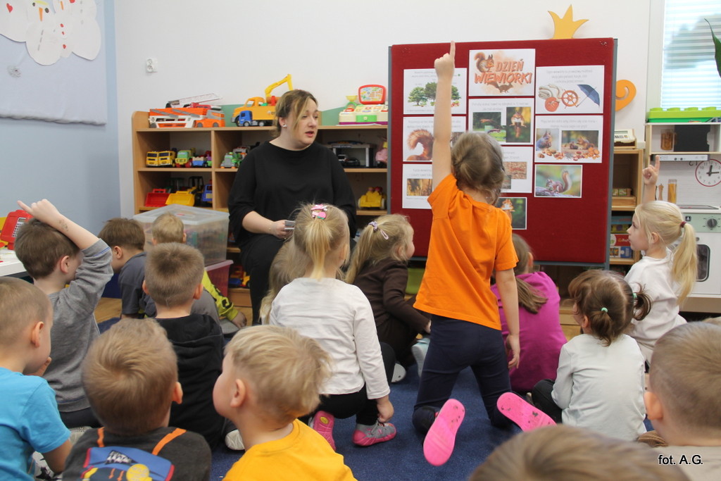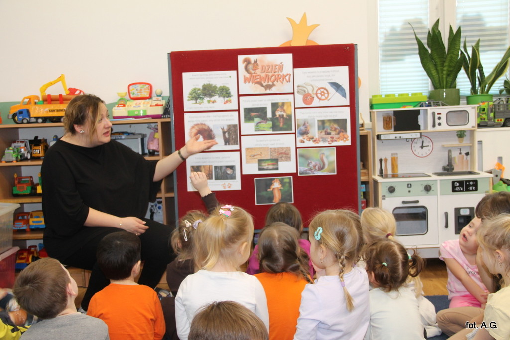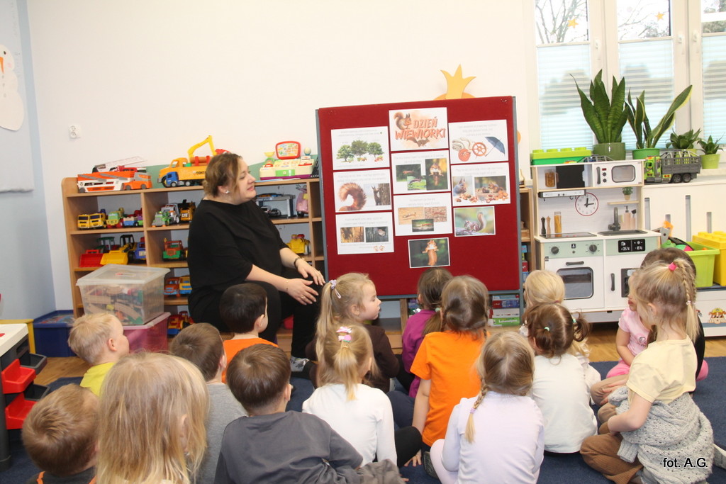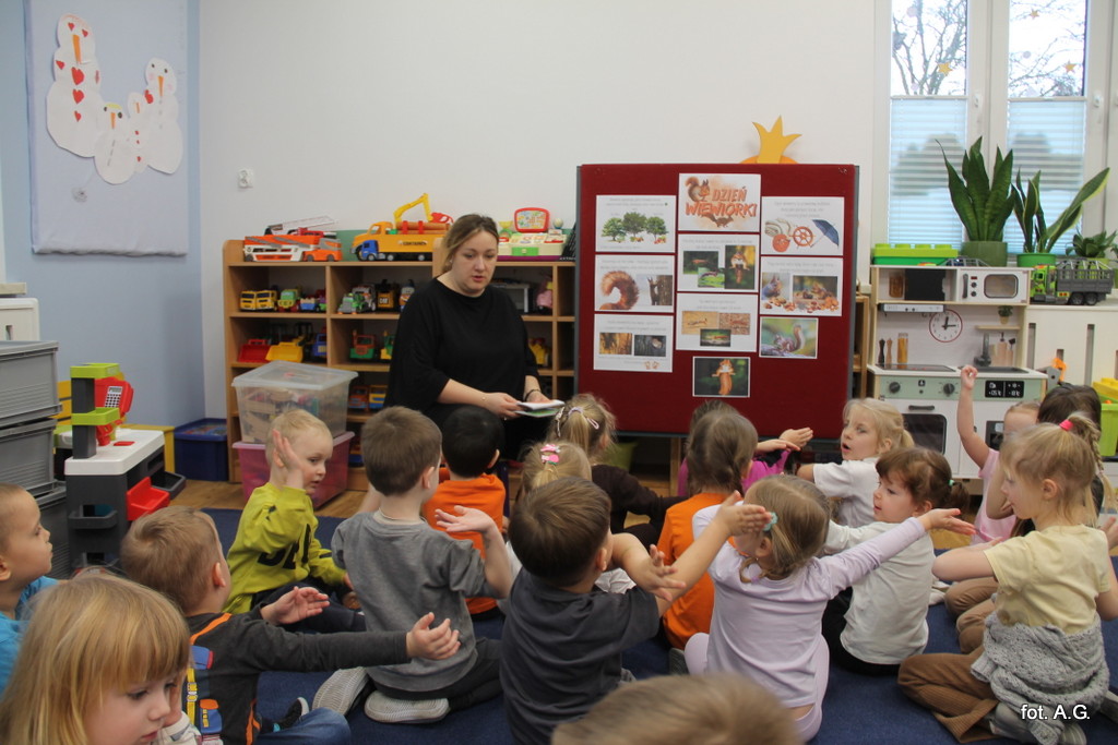 Choć Dzień Wiewiórki obchodzony jest 21 stycznia, w naszym przedszkolu świętowaliśmy go dopiero dziś — i był to dzień pełen uśmiechu, ciekawostek oraz twórczej zabawy. Zajęcia poprowadziła Pani Maja, która w niezwykle interesujący sposób opowiedziała dzieciom o życiu tych sympatycznych, rudych mieszkańców lasu.