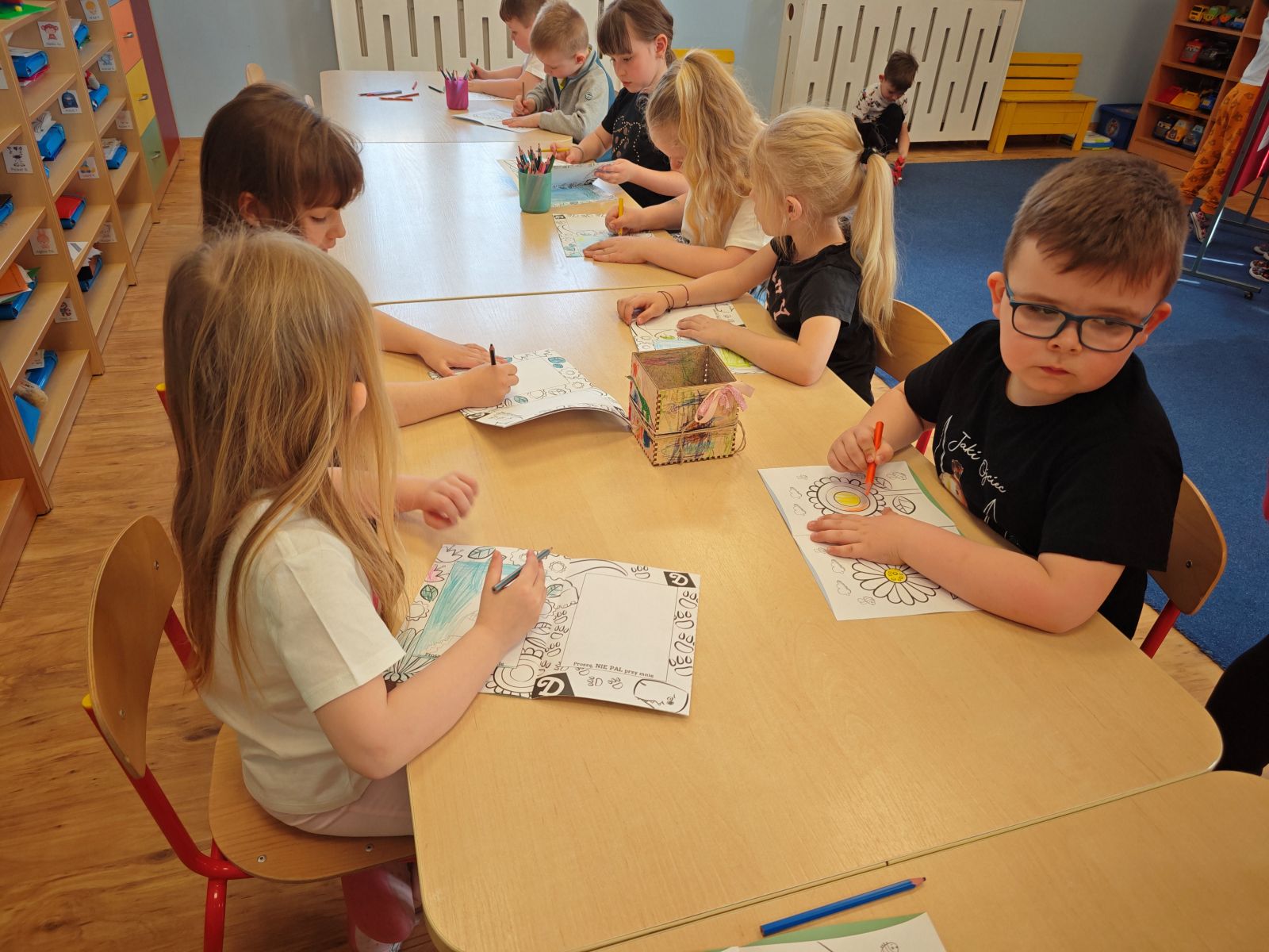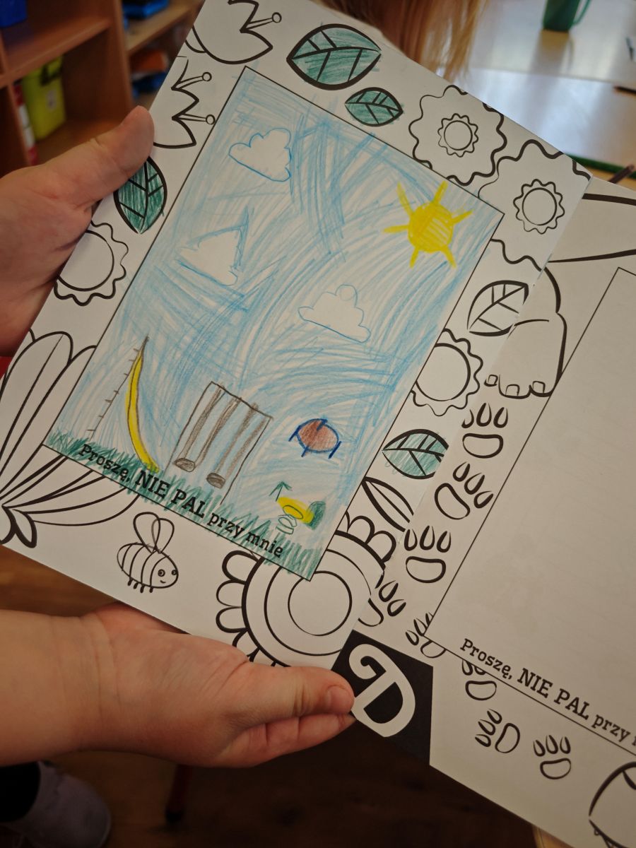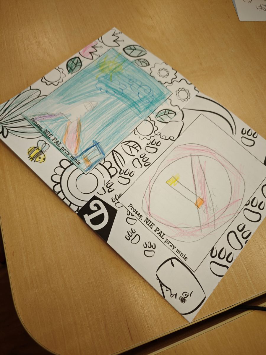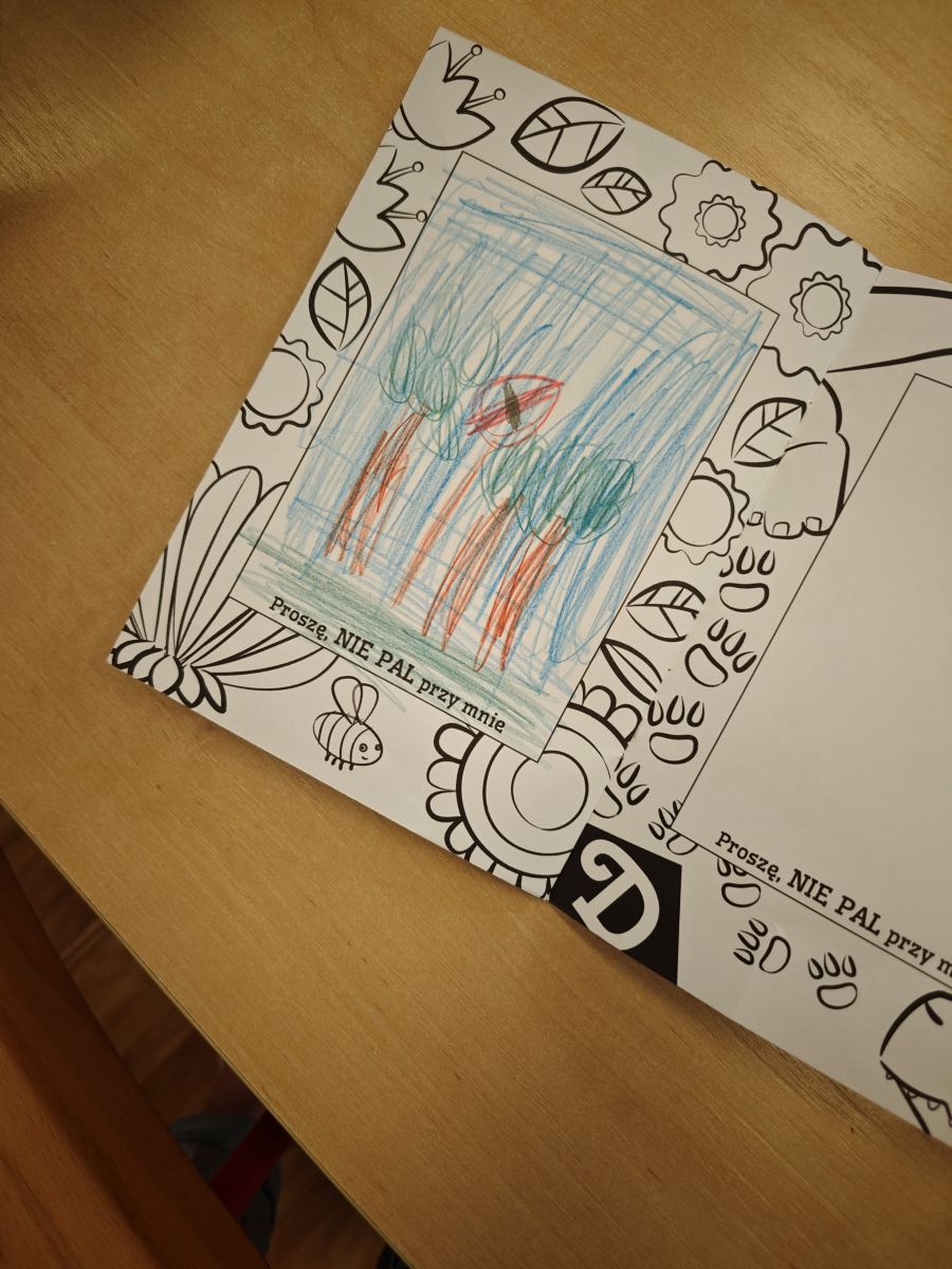 Na zakończenie zajęć mali artyści chwycili za kredki 🖍️ i przelali swoje pomysły na papier. Powstały przepiękne prace przedstawiające „Moje bezpieczne miejsce wolne od dymu”. 🎨🏠