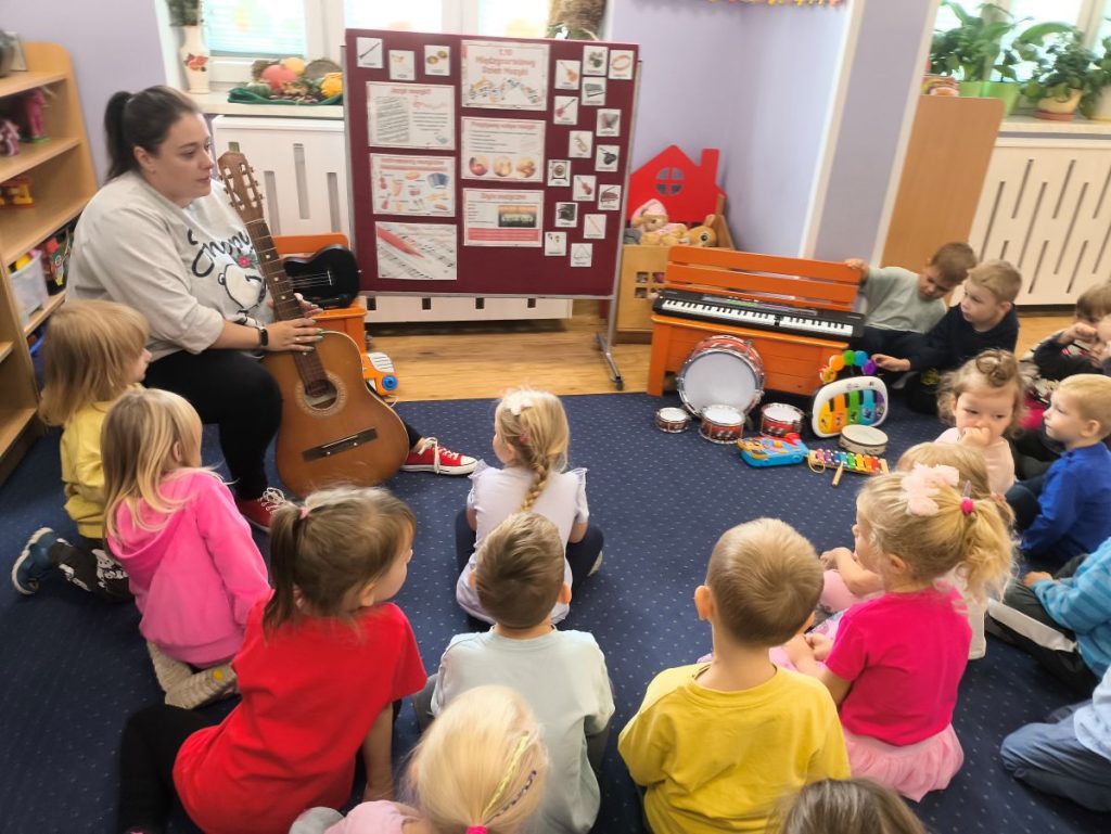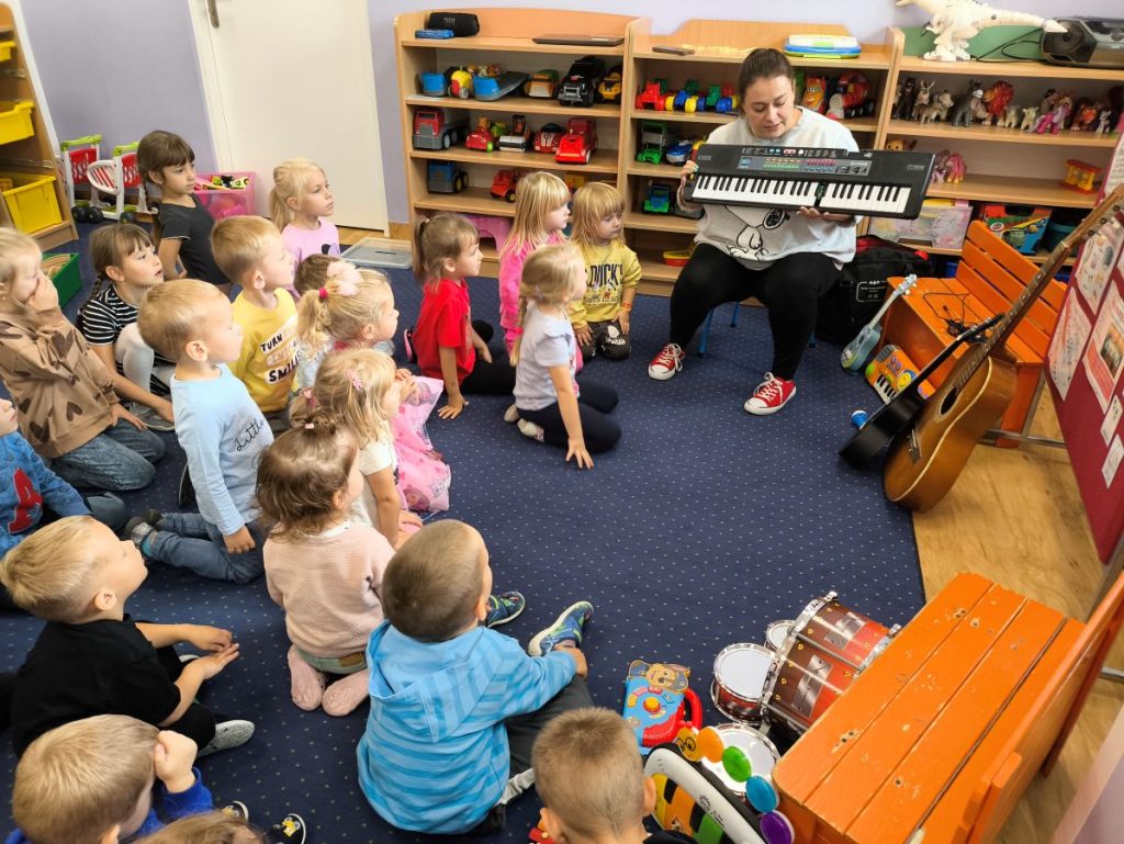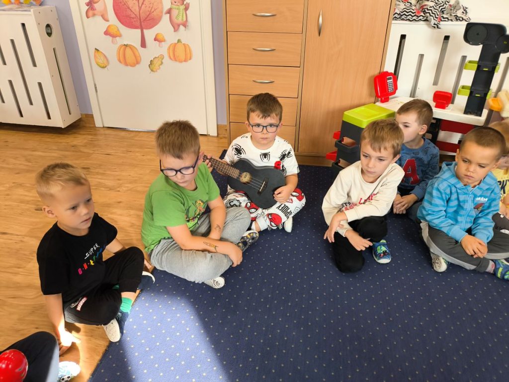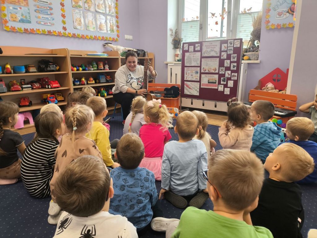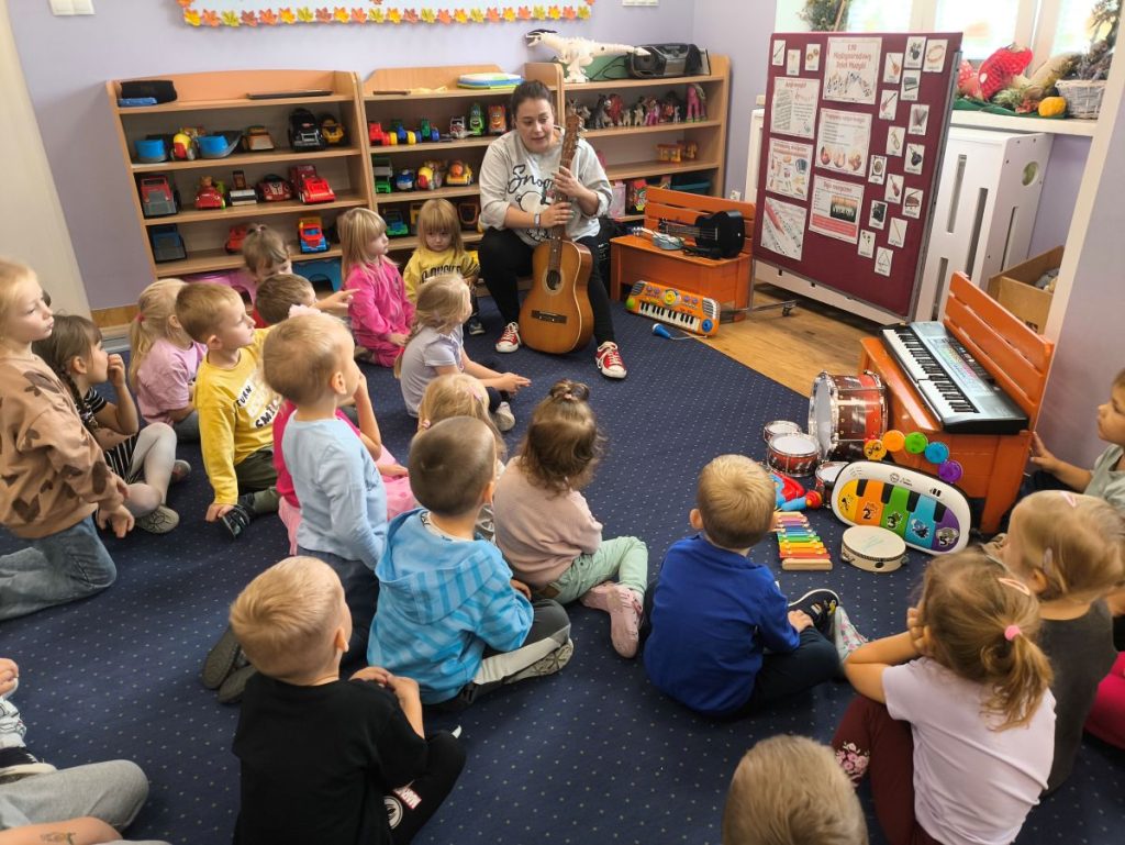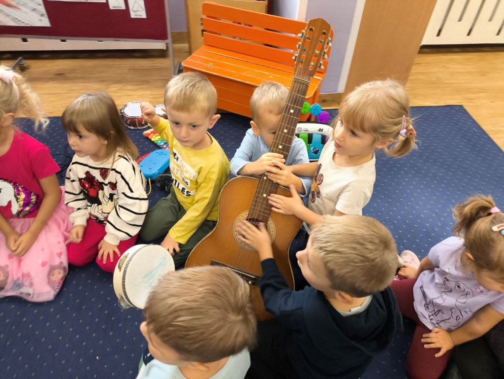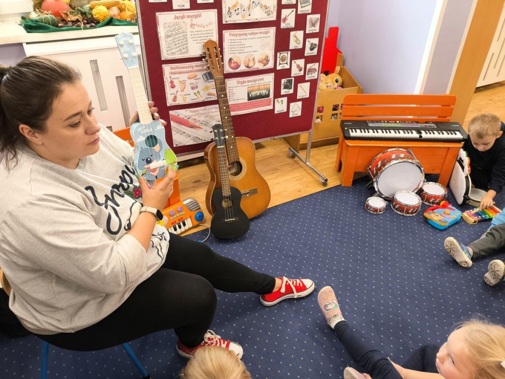 Na początku dzieci poznały różne instrumenty muzyczne 🥁🎺🎻 i mogły usłyszeć, jak brzmi każdy z nich. Największą frajdą było samodzielne granie – nasi mali muzycy spróbowali swoich sił nawet na ukulele 🎸🌟