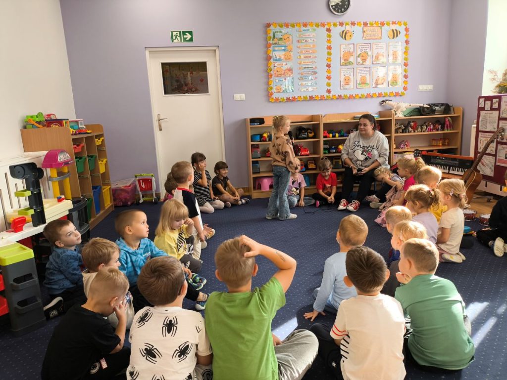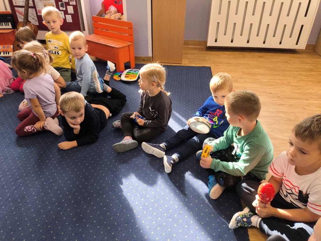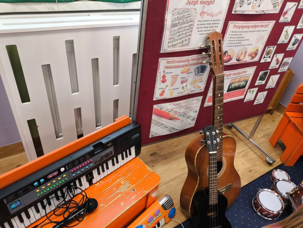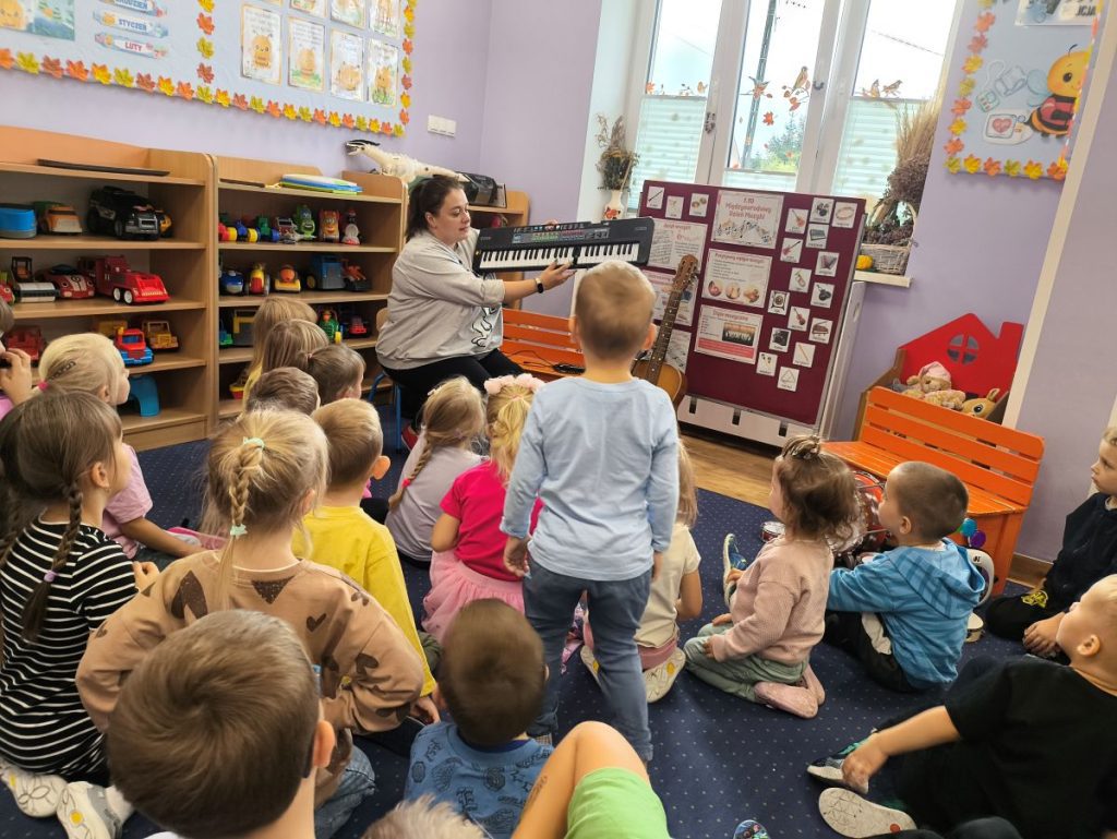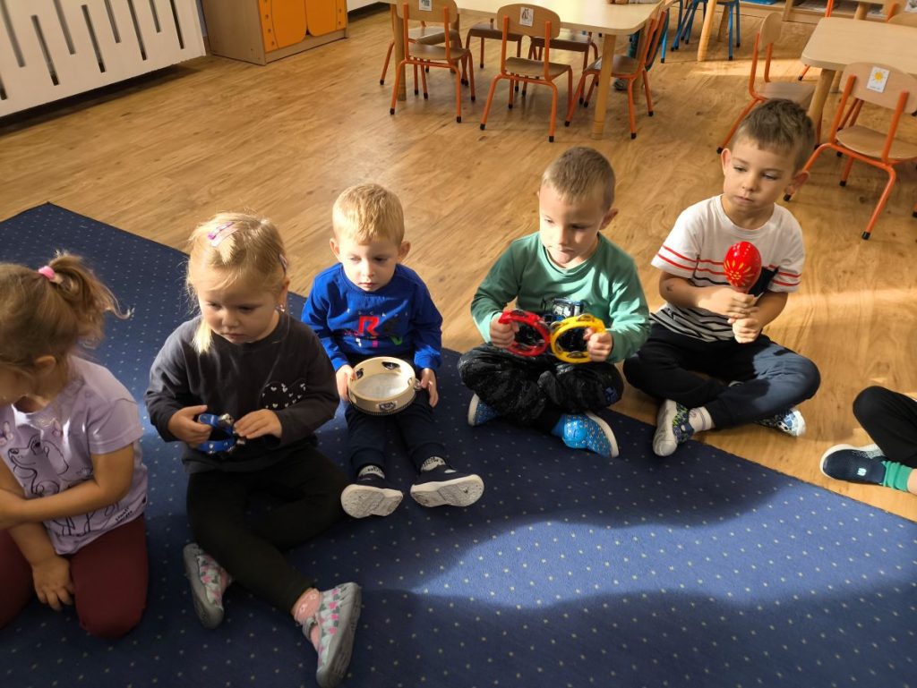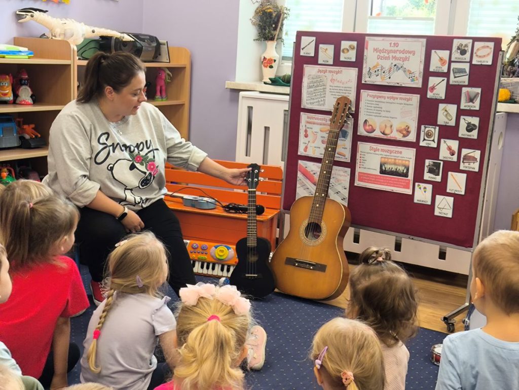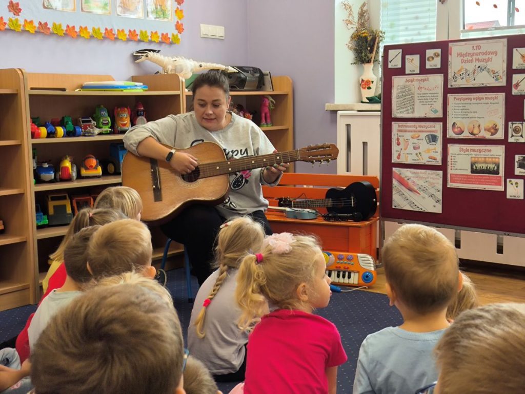 Na początku dzieci poznały różne instrumenty muzyczne 🥁🎺🎻 i mogły usłyszeć, jak brzmi każdy z nich. Największą frajdą było samodzielne granie – nasi mali muzycy spróbowali swoich sił nawet na ukulele 🎸🌟