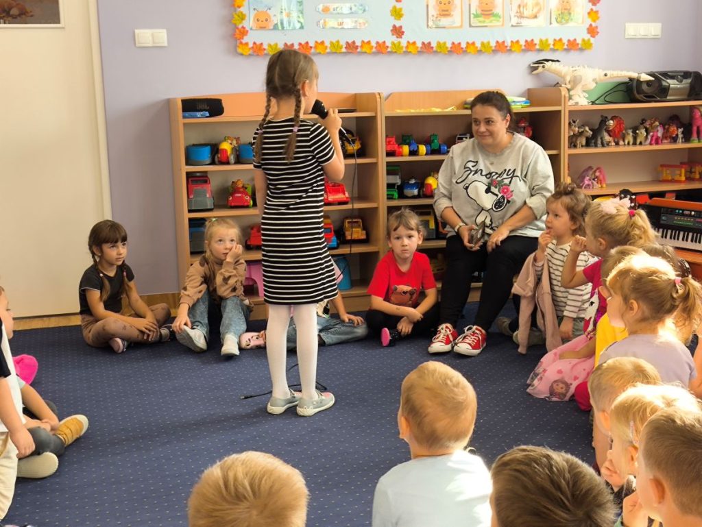 Nie zabrakło także wspólnej zabawy – śpiewaliśmy, tańczyliśmy 💃🕺, a dzieci występowały śpiewając do mikrofonu 🎤🎶 Sala wypełniła się muzyką, uśmiechem i radosną atmosferą – prawdziwy koncert w naszym przedszkolu! 🌟😍