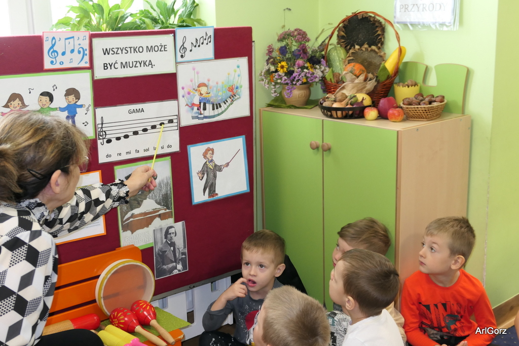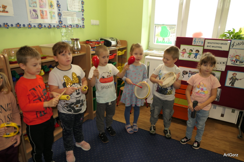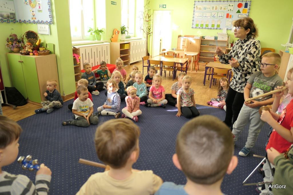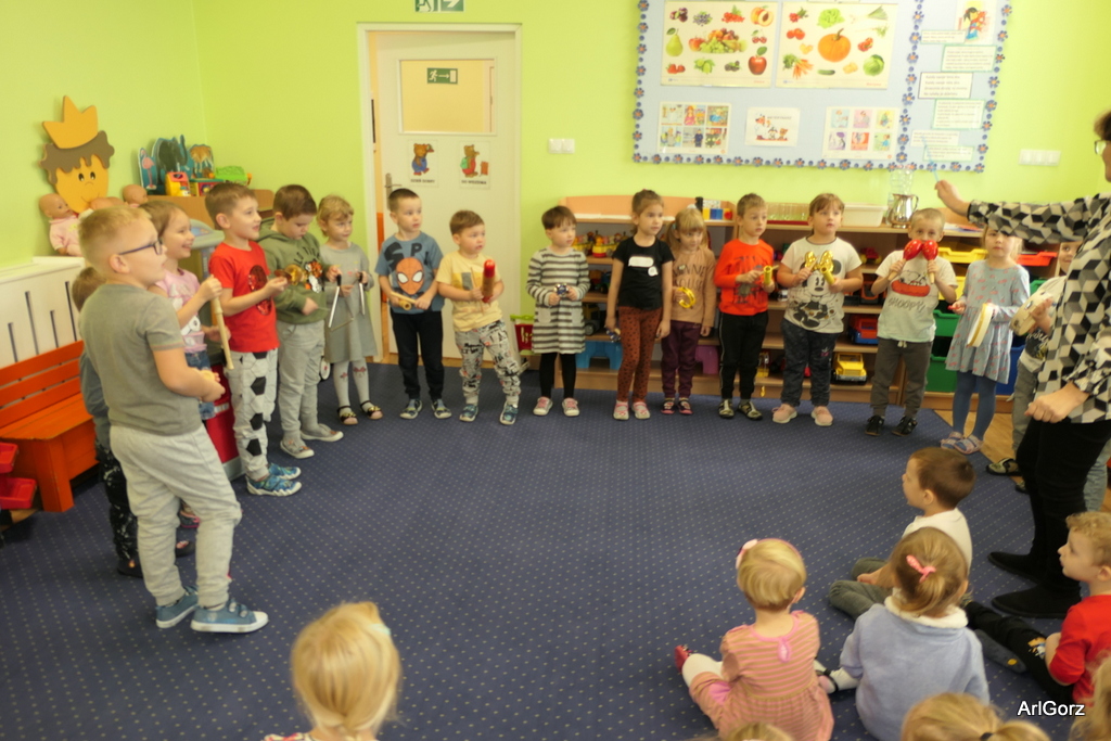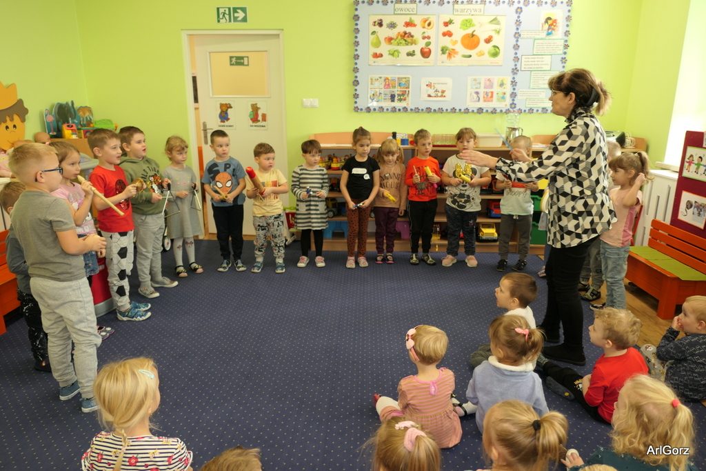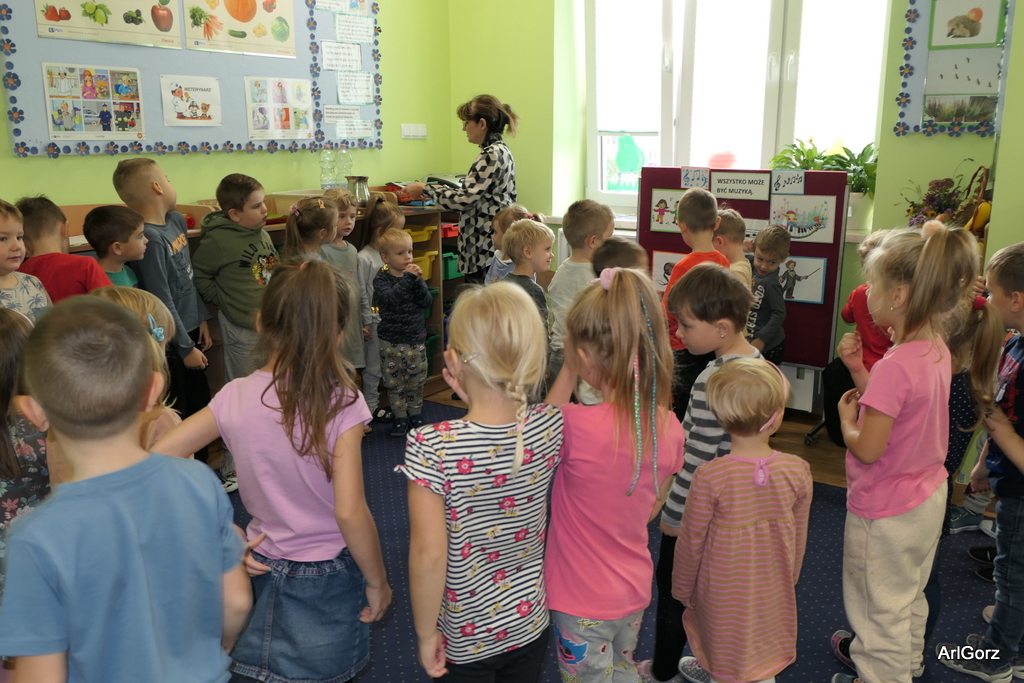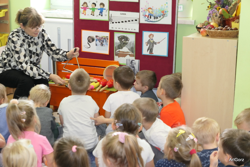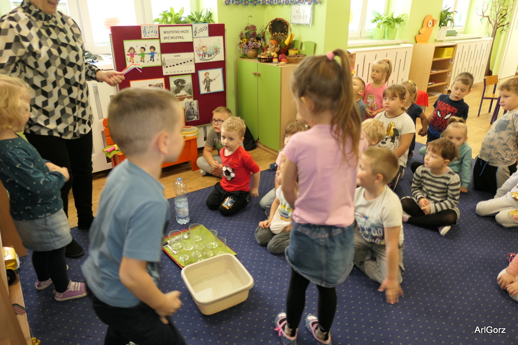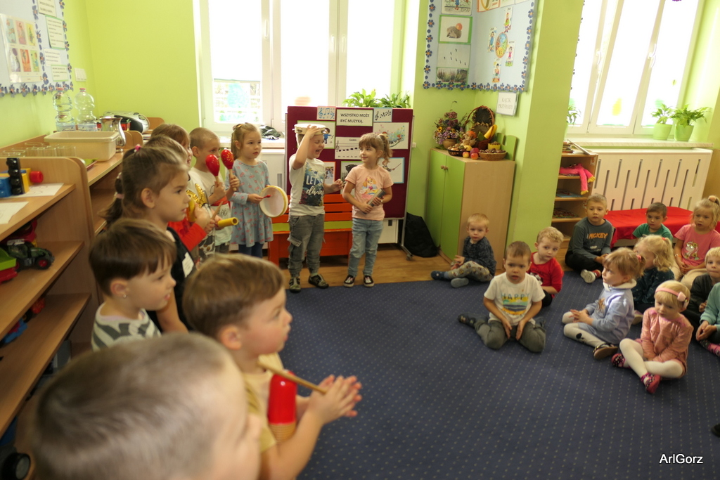 3 października w naszym przedszkolu obchodziliśmy Międzynarodowy Dzień Muzyki. W tym dniu nasze przedszkolaki przeniosły się do krainy dźwięków, aby wspólnie bawić się muzyką. Bębenek czy tamburyno, kołatki, talerze…etc.  to tylko niektóre instrumenty, które dzieci mogły poznać i usłyszeć na żywo, ale również spróbować na nich zagrać, odkrywając przy tym swój talent muzyczny. Razem stworzyliśmy prawdziwą orkiestrę. Przedszkolaki nie tylko uważnie słuchały utworów muzycznych, ale również aktywnie brały udział w zabawach muzyczno-ruchowych.  Przy okazji realizacji Dnia Muzyki przedszkolaki zgodnie z programem, który realizujemy w tym roku: „Z darami natury świat nie jest ponury” poznały walory “Wodnej muzyki”. Było pluskanie, przelewanie, bomblowanie i inne zabawy z wodą.  Zabawa była wyśmienita a dzieci radosne i zadowolone.
