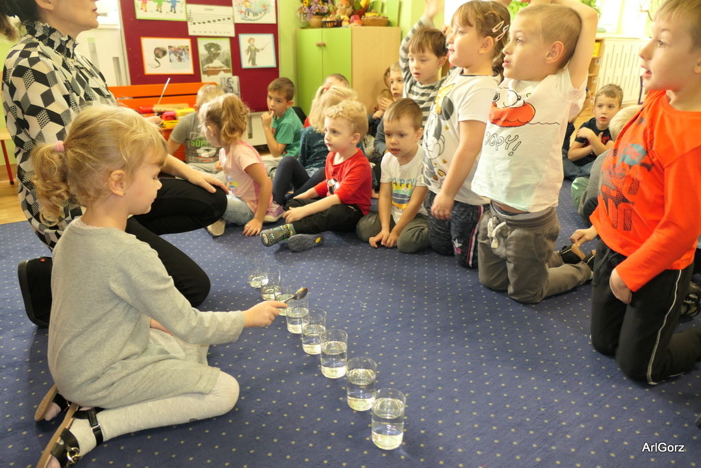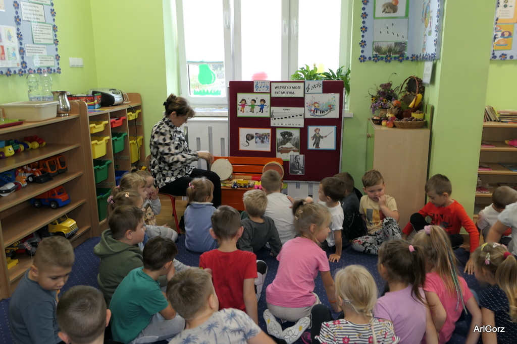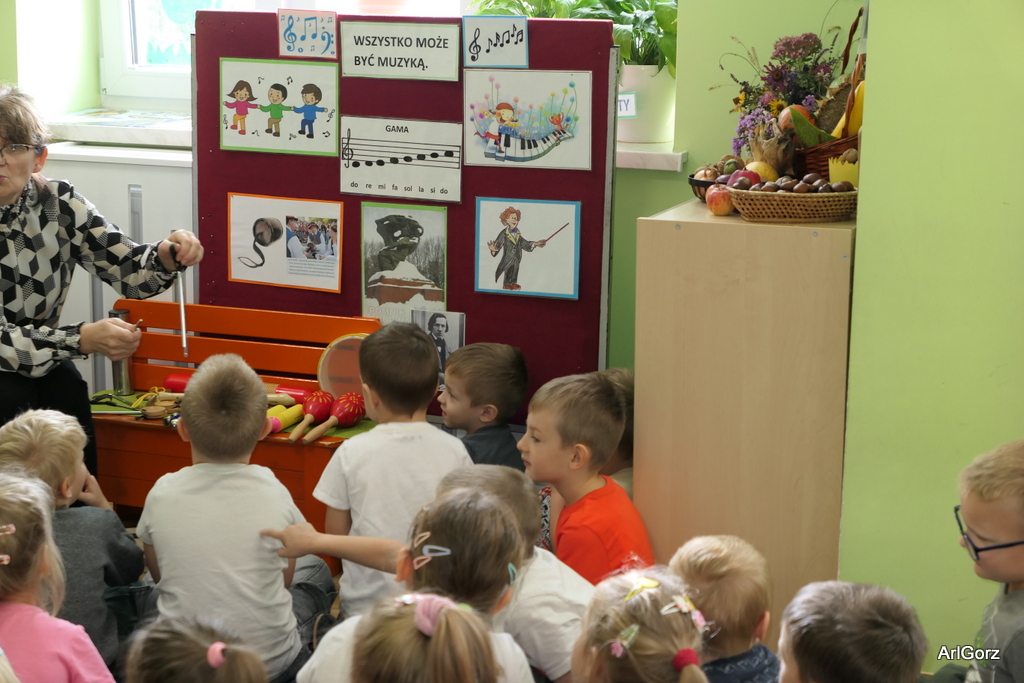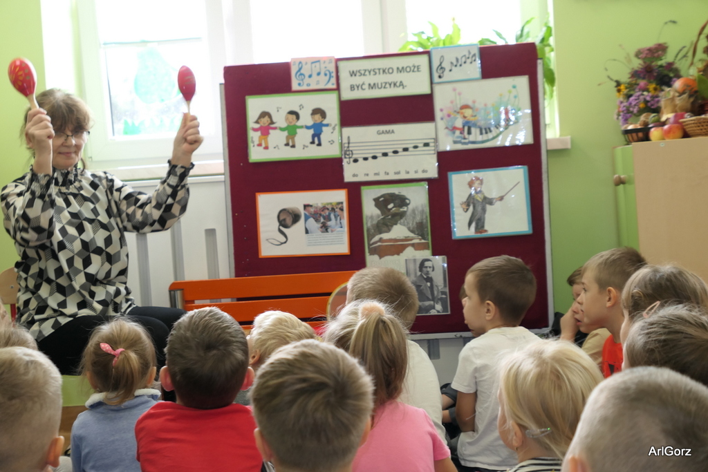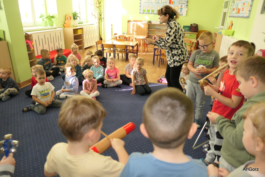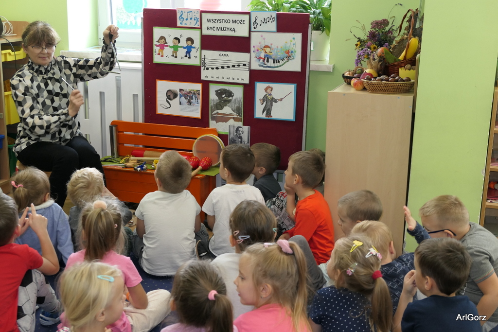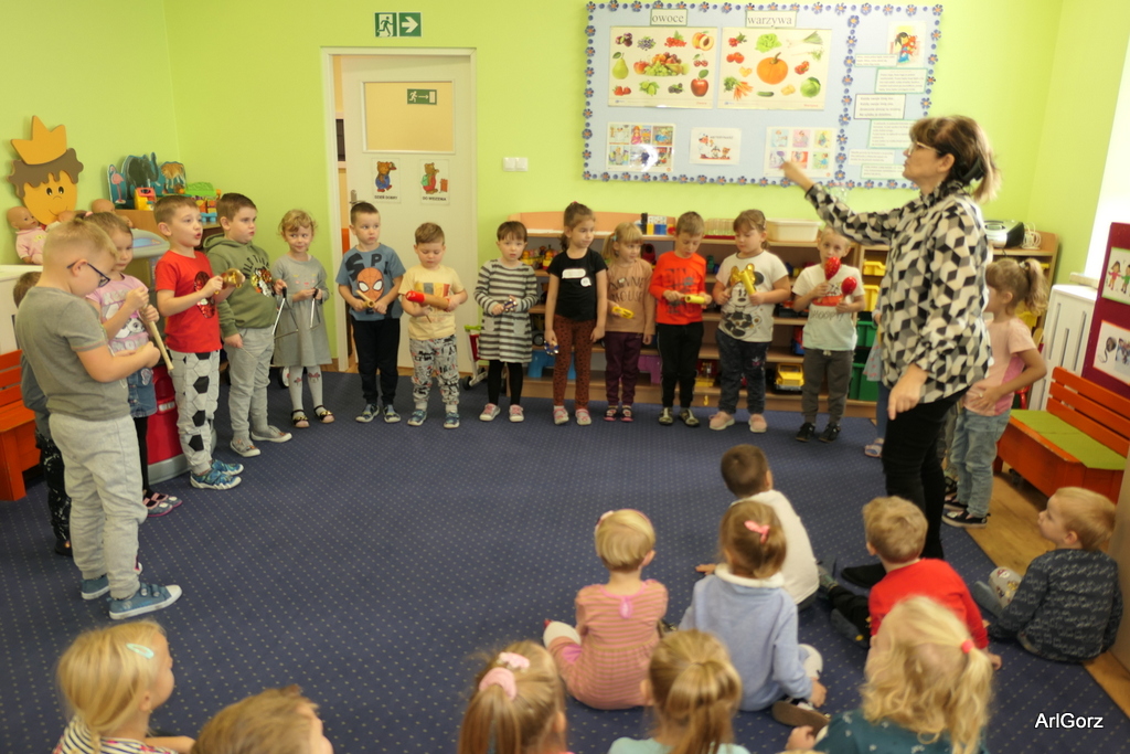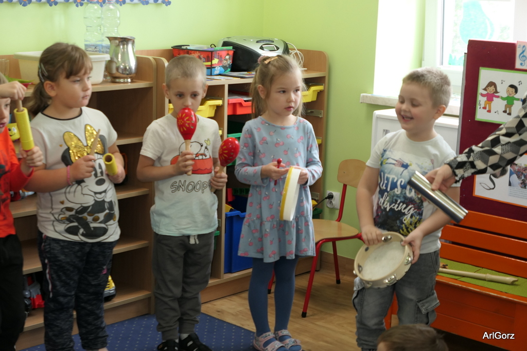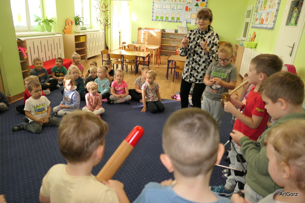 3 października w naszym przedszkolu obchodziliśmy Międzynarodowy Dzień Muzyki. W tym dniu nasze przedszkolaki przeniosły się do krainy dźwięków, aby wspólnie bawić się muzyką. Bębenek czy tamburyno, kołatki, talerze…etc.  to tylko niektóre instrumenty, które dzieci mogły poznać i usłyszeć na żywo, ale również spróbować na nich zagrać, odkrywając przy tym swój talent muzyczny. Razem stworzyliśmy prawdziwą orkiestrę. Przedszkolaki nie tylko uważnie słuchały utworów muzycznych, ale również aktywnie brały udział w zabawach muzyczno-ruchowych.  Przy okazji realizacji Dnia Muzyki przedszkolaki zgodnie z programem, który realizujemy w tym roku: „Z darami natury świat nie jest ponury” poznały walory “Wodnej muzyki”. Było pluskanie, przelewanie, bomblowanie i inne zabawy z wodą.  Zabawa była wyśmienita a dzieci radosne i zadowolone.