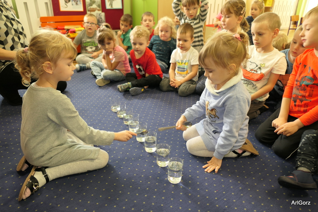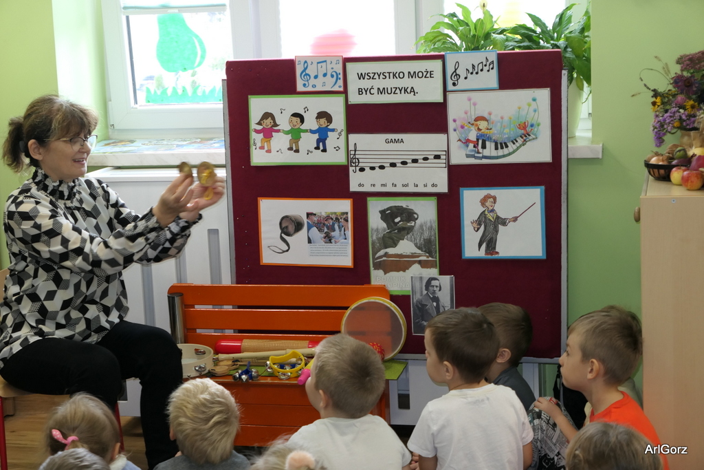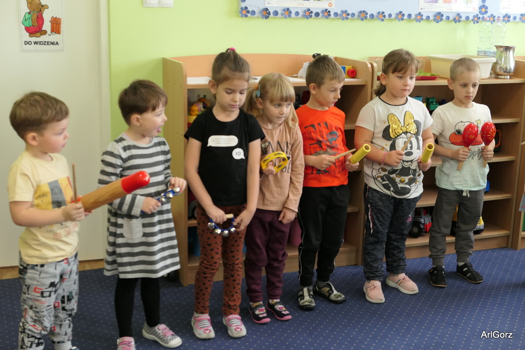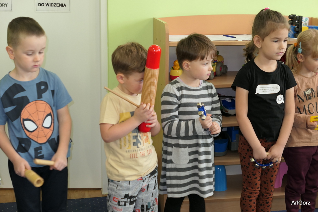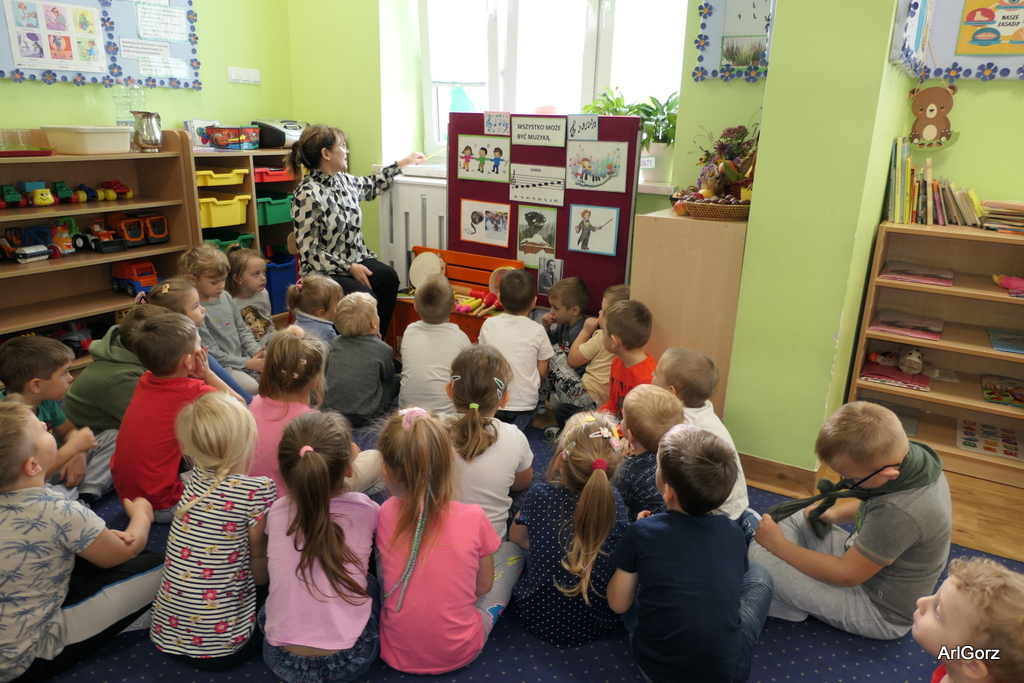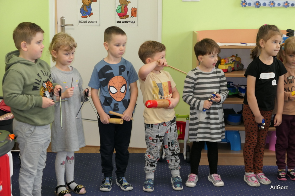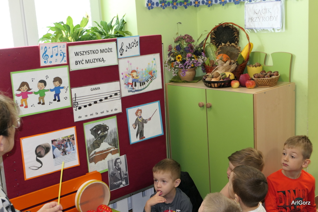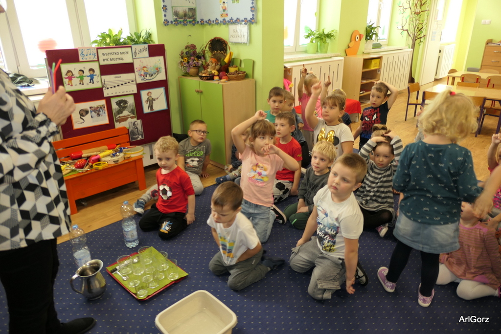 3 października w naszym przedszkolu obchodziliśmy Międzynarodowy Dzień Muzyki. W tym dniu nasze przedszkolaki przeniosły się do krainy dźwięków, aby wspólnie bawić się muzyką. Bębenek czy tamburyno, kołatki, talerze…etc.  to tylko niektóre instrumenty, które dzieci mogły poznać i usłyszeć na żywo, ale również spróbować na nich zagrać, odkrywając przy tym swój talent muzyczny. Razem stworzyliśmy prawdziwą orkiestrę. Przedszkolaki nie tylko uważnie słuchały utworów muzycznych, ale również aktywnie brały udział w zabawach muzyczno-ruchowych.  Przy okazji realizacji Dnia Muzyki przedszkolaki zgodnie z programem, który realizujemy w tym roku: „Z darami natury świat nie jest ponury” poznały walory “Wodnej muzyki”. Było pluskanie, przelewanie, bomblowanie i inne zabawy z wodą.  Zabawa była wyśmienita a dzieci radosne i zadowolone.