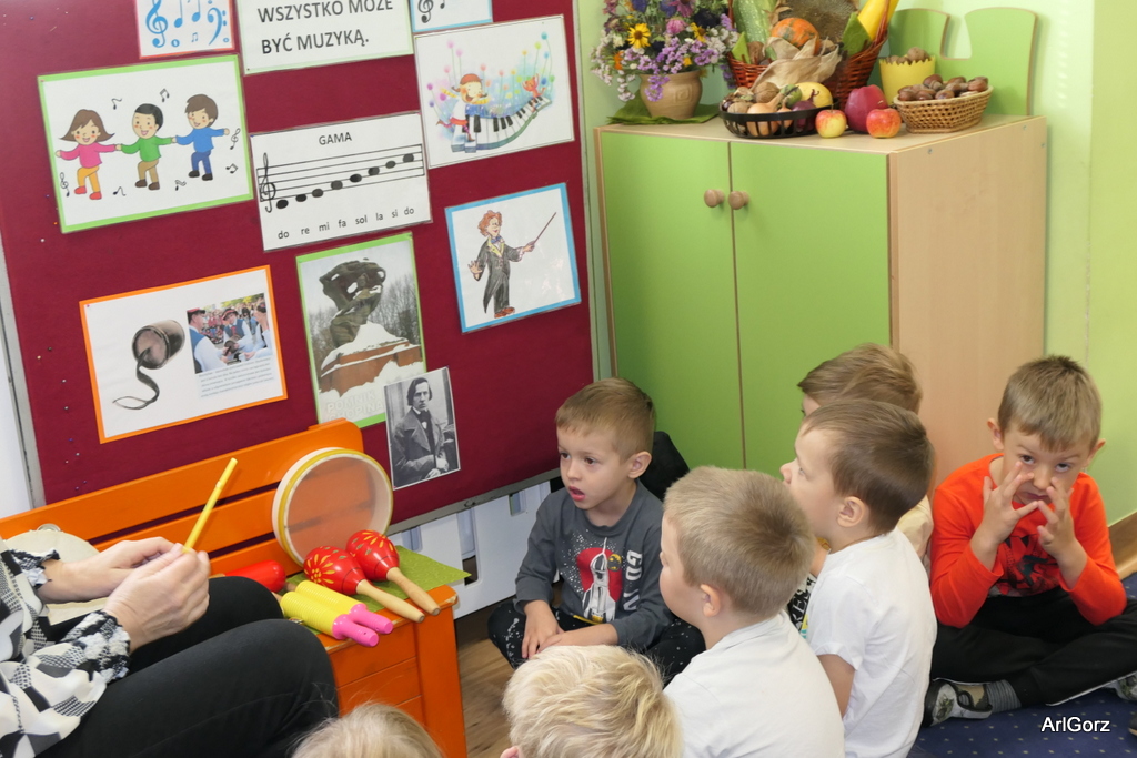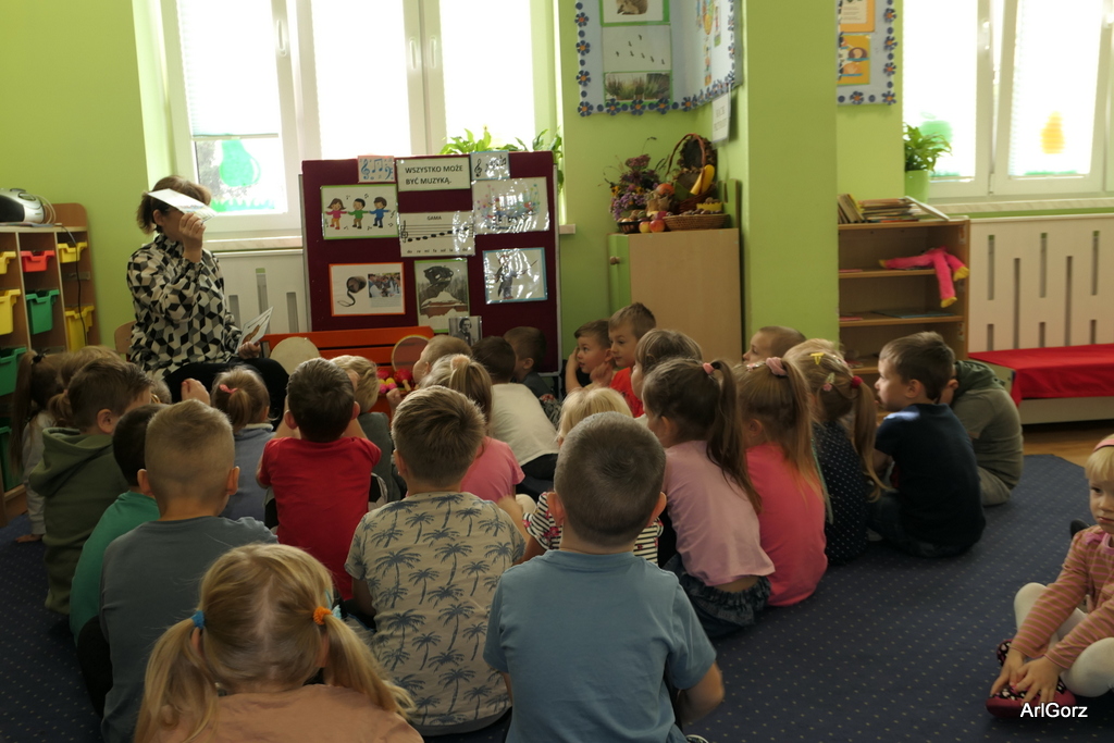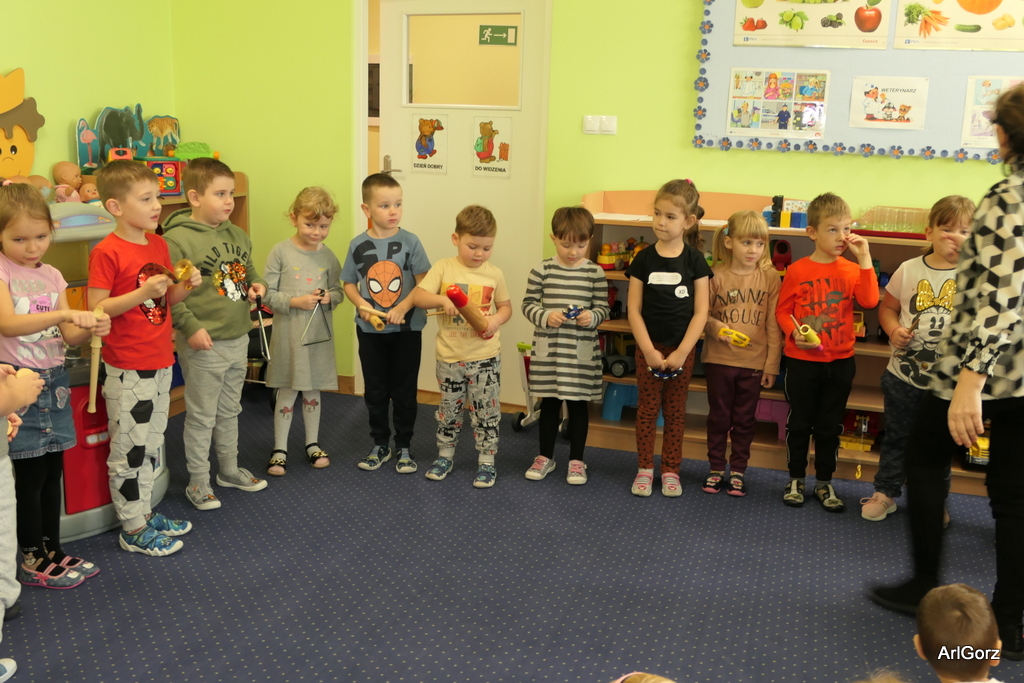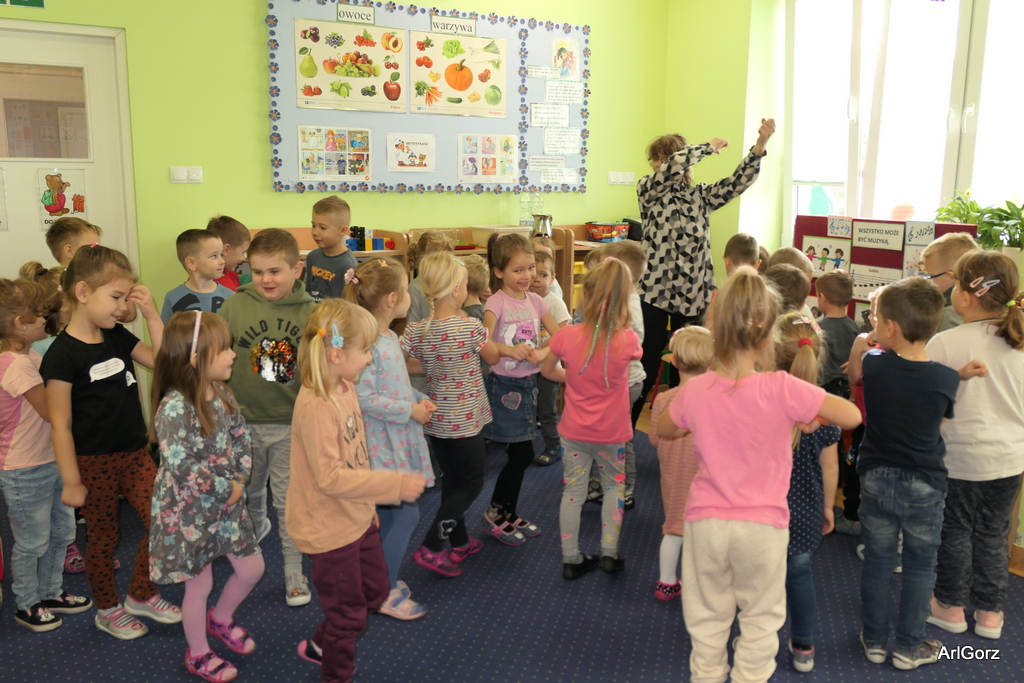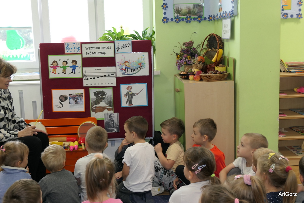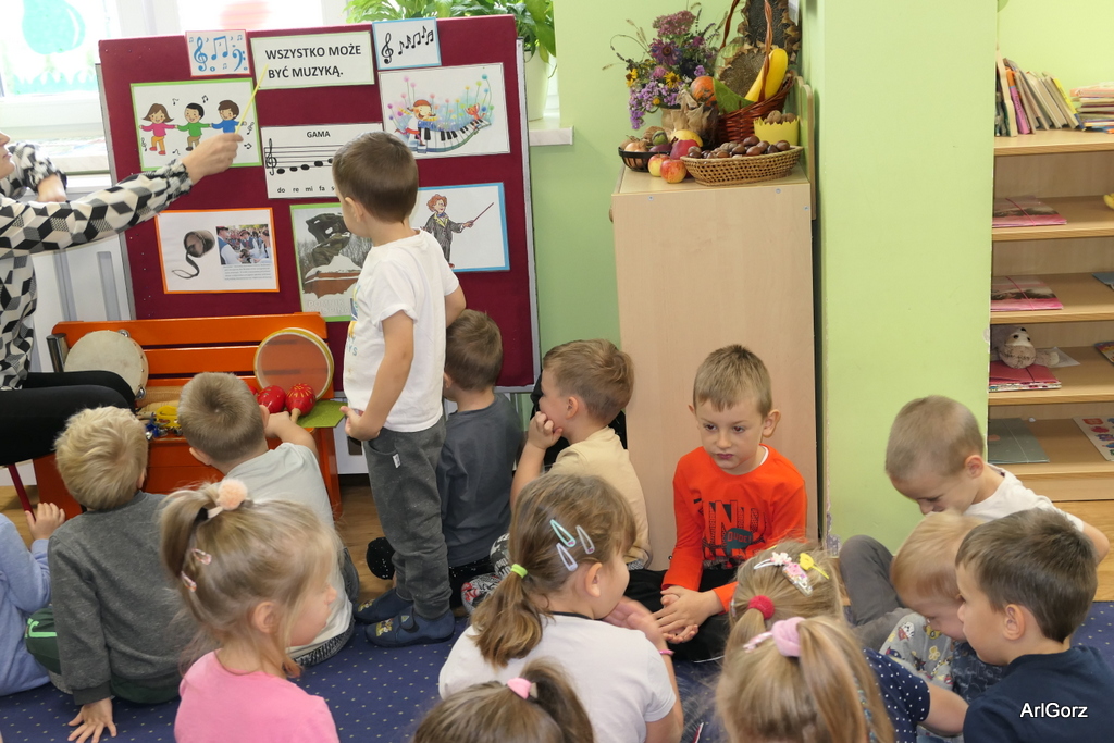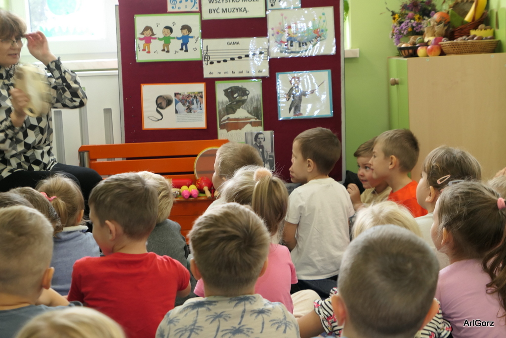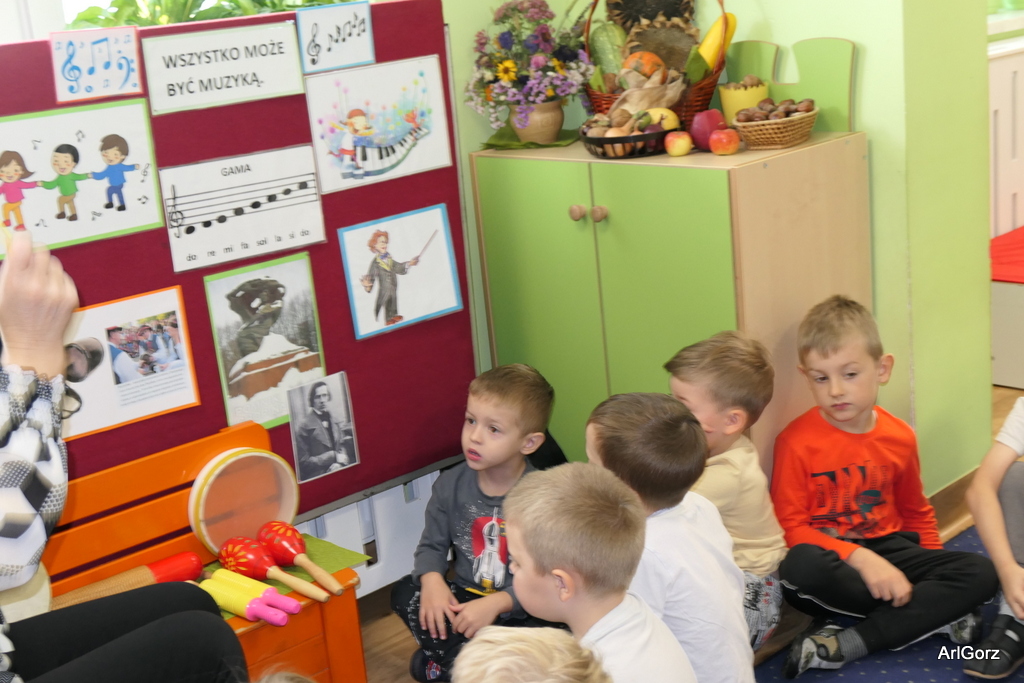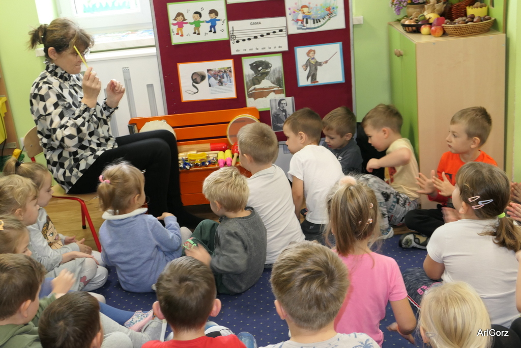 3 października w naszym przedszkolu obchodziliśmy Międzynarodowy Dzień Muzyki. W tym dniu nasze przedszkolaki przeniosły się do krainy dźwięków, aby wspólnie bawić się muzyką. Bębenek czy tamburyno, kołatki, talerze…etc.  to tylko niektóre instrumenty, które dzieci mogły poznać i usłyszeć na żywo, ale również spróbować na nich zagrać, odkrywając przy tym swój talent muzyczny. Razem stworzyliśmy prawdziwą orkiestrę. Przedszkolaki nie tylko uważnie słuchały utworów muzycznych, ale również aktywnie brały udział w zabawach muzyczno-ruchowych.  Przy okazji realizacji Dnia Muzyki przedszkolaki zgodnie z programem, który realizujemy w tym roku: „Z darami natury świat nie jest ponury” poznały walory “Wodnej muzyki”. Było pluskanie, przelewanie, bomblowanie i inne zabawy z wodą.  Zabawa była wyśmienita a dzieci radosne i zadowolone.