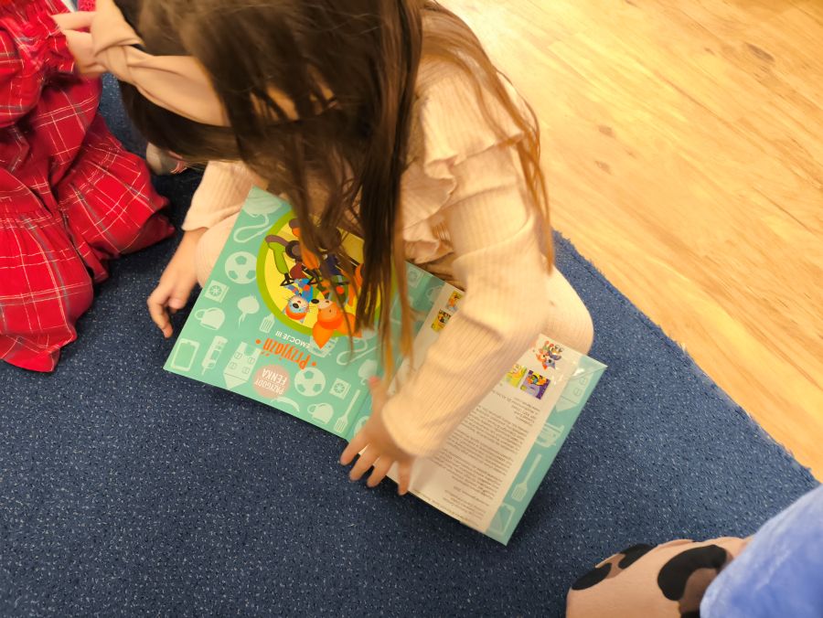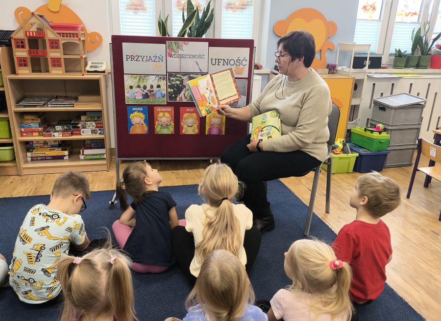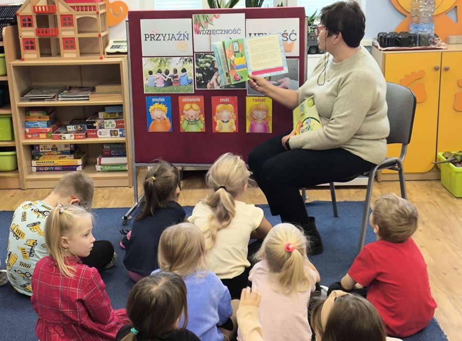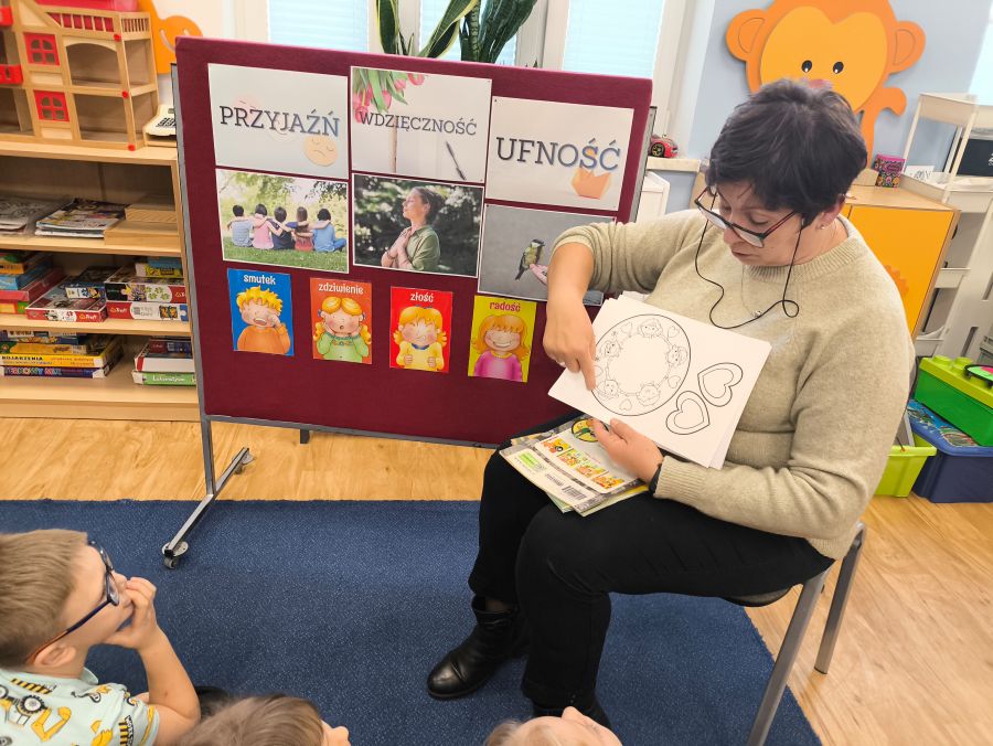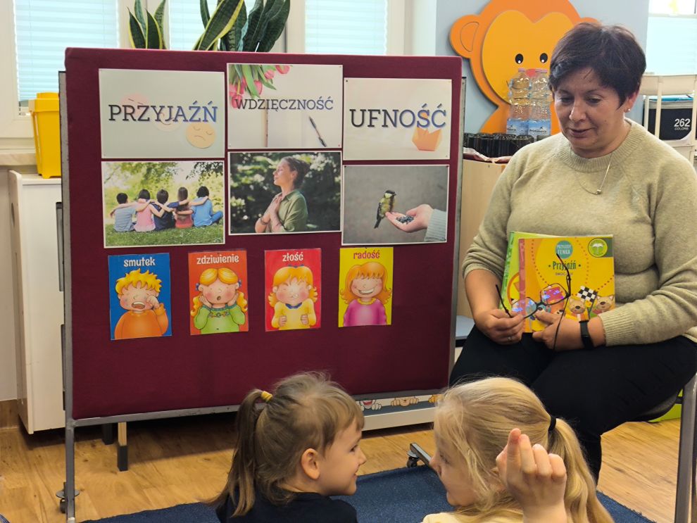 Po lekturze dzieci prowadziły z Panią Iwonką rozmowę o emocjach, dzieliły się swoimi doświadczeniami i zastanawiały się, jak w codziennych sytuacjach można okazywać wdzięczność, przyjaźń i ufność 💬😊 Była to doskonała okazja do rozwijania empatii oraz uważności na potrzeby innych.