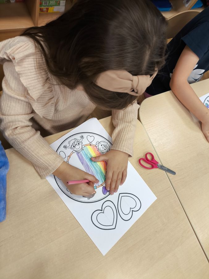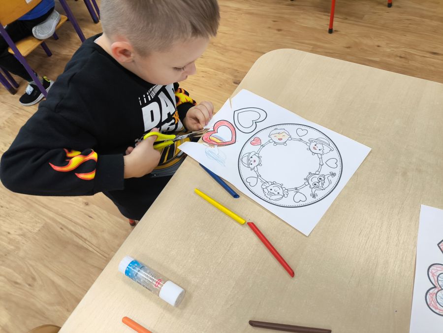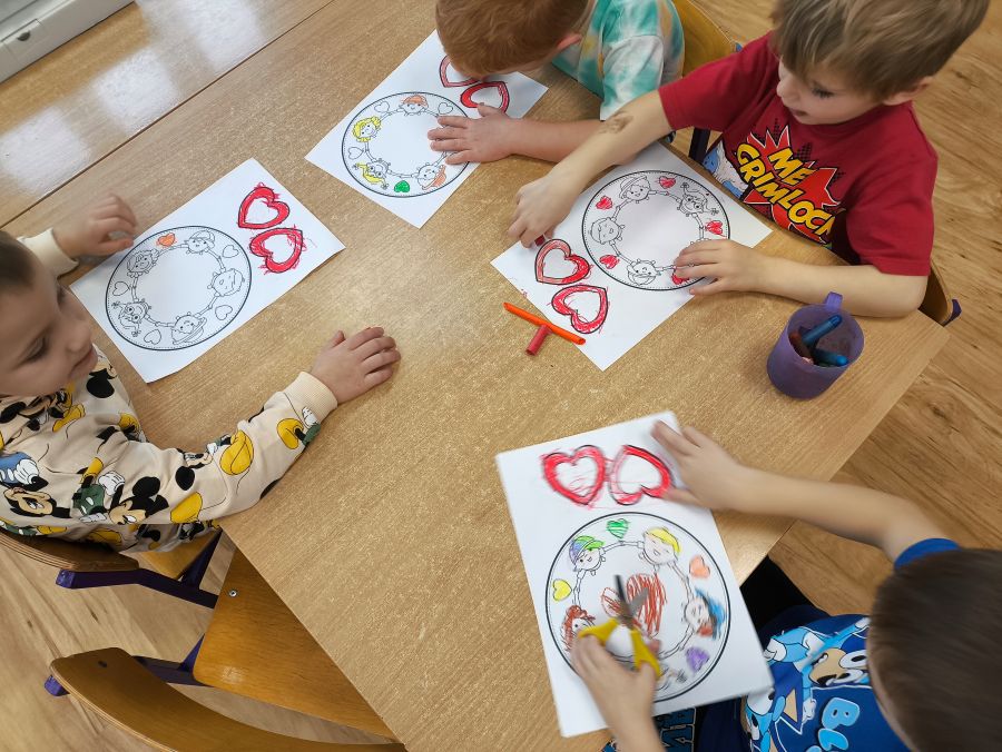 Na zakończenie zajęć przedszkolaki wspólnie wykonały okrąg wdzięczności, ufności i przyjaźni – piękny symbol jedności, wzajemnego wsparcia i dobrych relacji, wykonane przez siebie okręgi wręczały swoim kolegom, koleżankom z grupy, albo brały je do swoich domów, by obdarować nimi członków swoich rodzin 🔄💞 Dzieci chętnie współpracowały, tworząc coś, co połączyło je we wspólnym, pozytywnym działaniu.