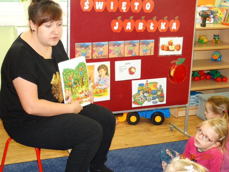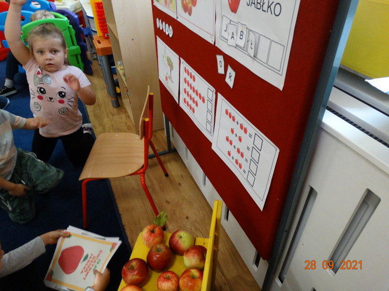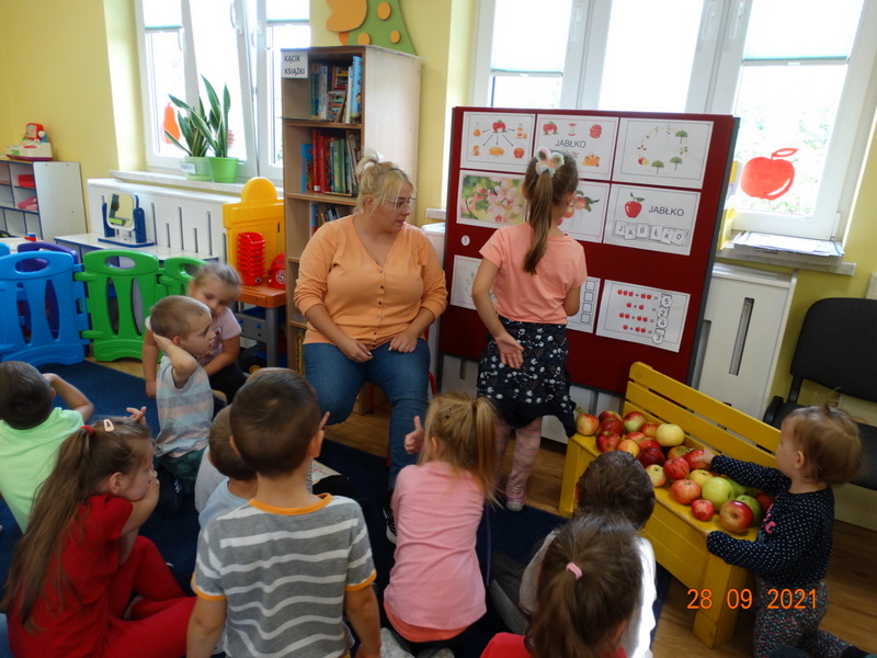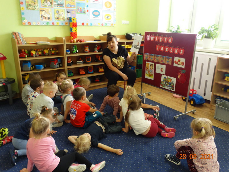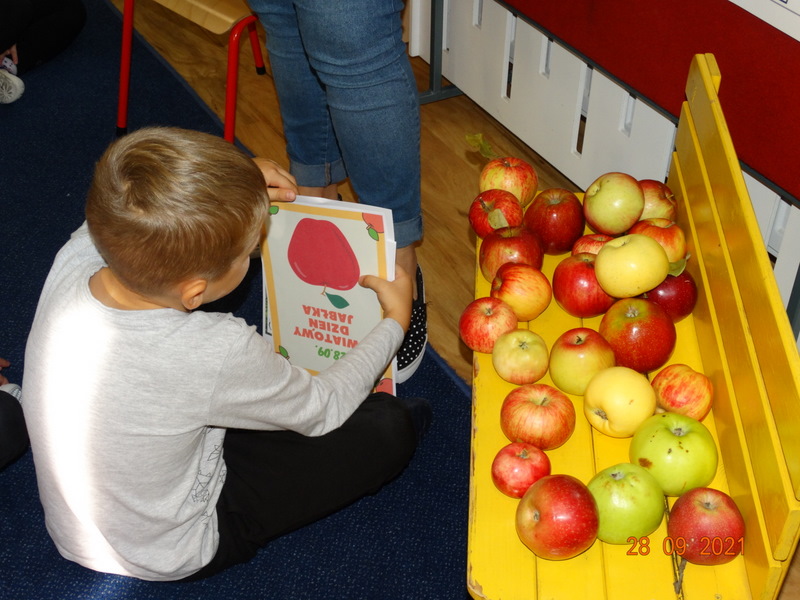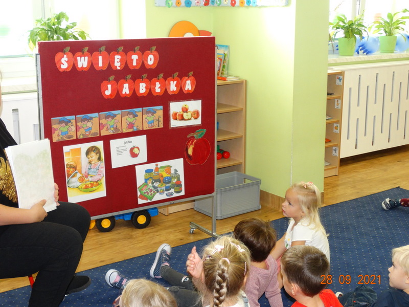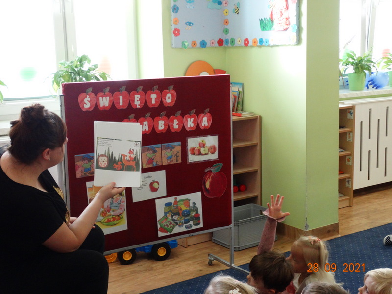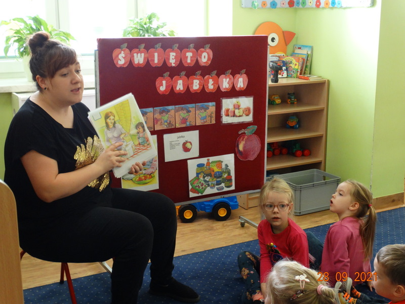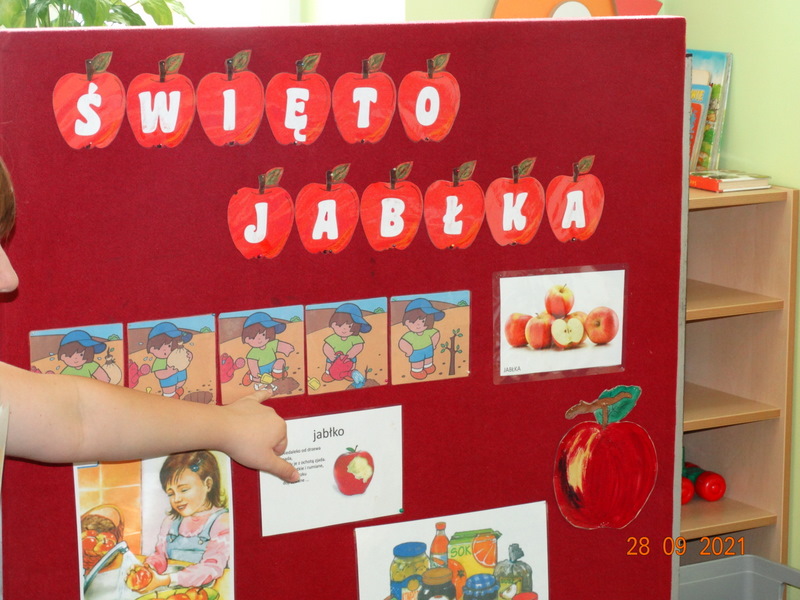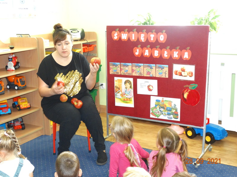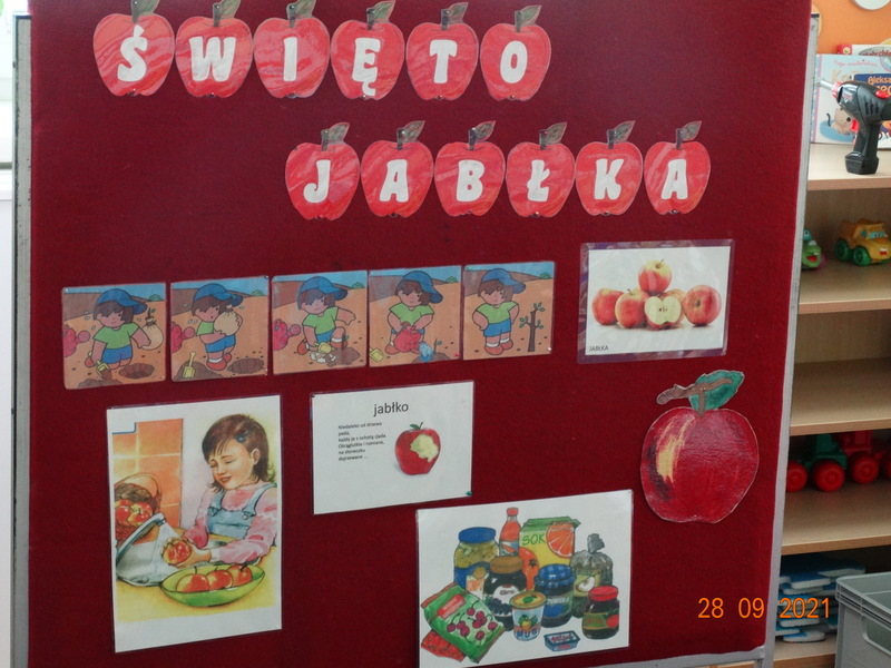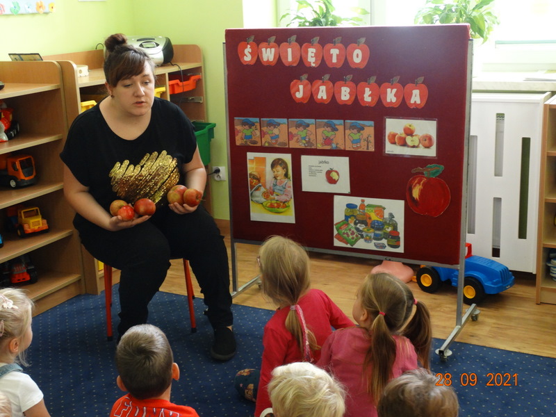 28 września w naszym przedszkolu zorganizowane zostało Święto Jabłka. W tym dniu przedszkolaki poznały różne gatunki jabłek, rozpoznawały zapach i smak tych owoców oraz zdobywały wiadomości na temat potraw i przetworów z jabłek. Nasze prace plastyczne zamieniły się w kolorowe sady, na których królowały oczywiście jabłuszka. Ponadto wykonały kilka zadań matematycznych: tworzyły zbiory, przeliczały owoce, porównywały wielkość, wykonywały ćwiczenia wspomagające kształtowanie orientacji przestrzennej. Tego dnia w przedszkolnym menu oczywiście nie zabrakło soczystych jabłek. Głównym celem tego dnia było zachęcanie przedszkolaków do spożywania owoców i to pod różnymi postaciami, z powodu ich walorów odżywczych i zdrowotnych.