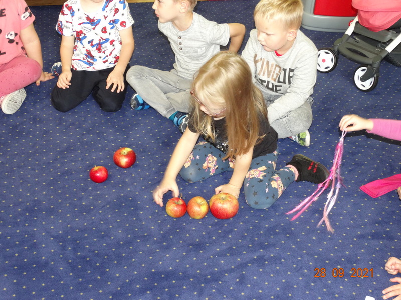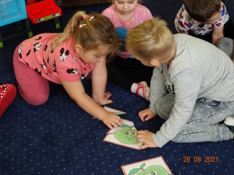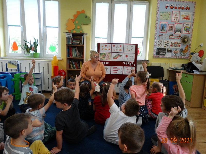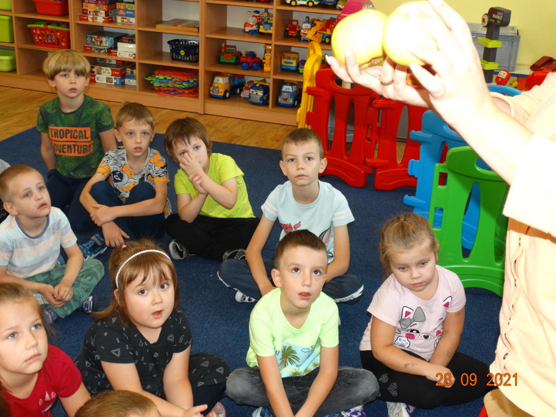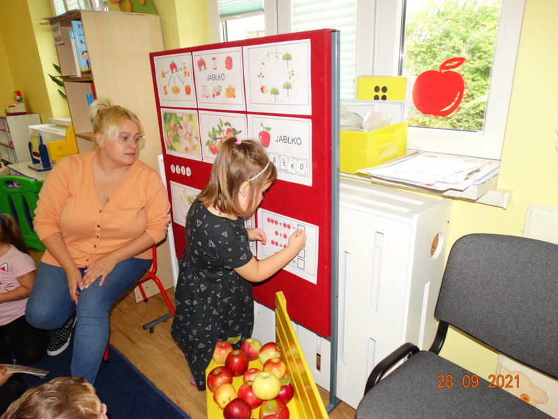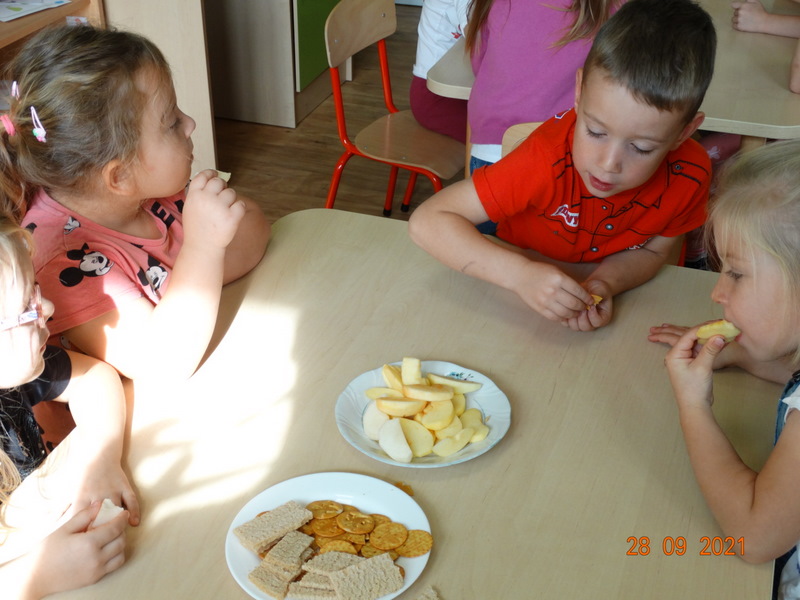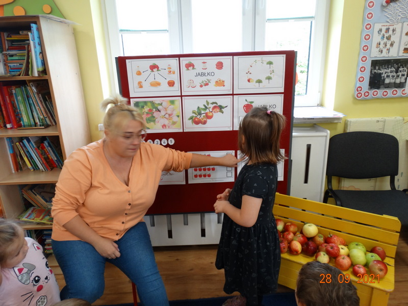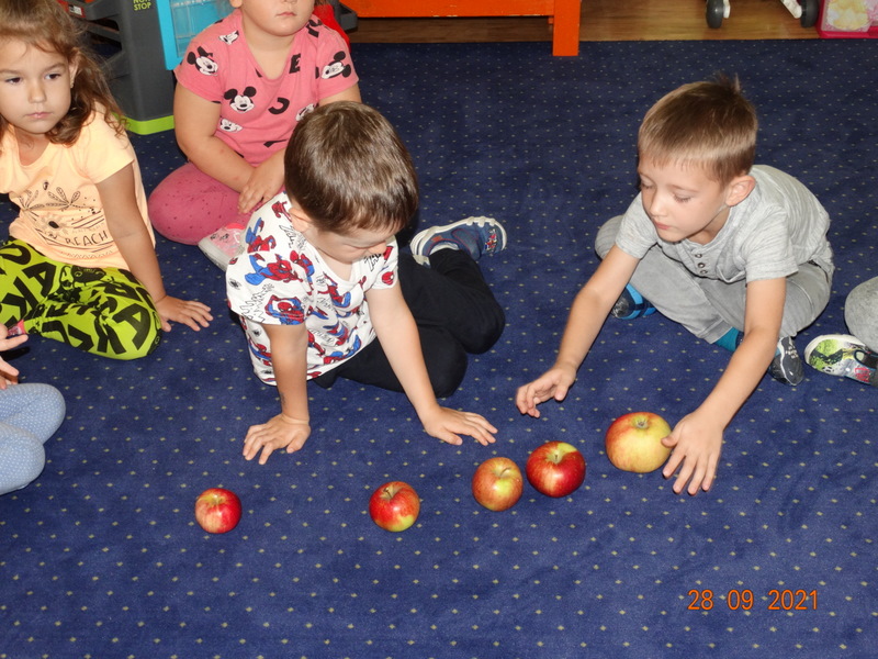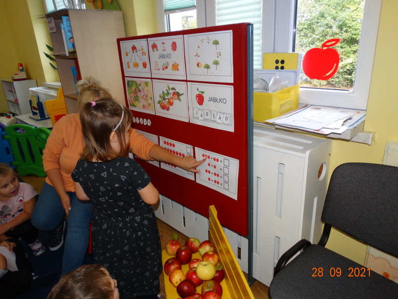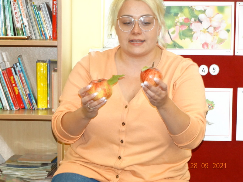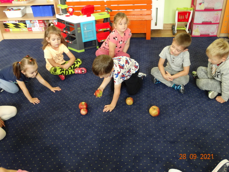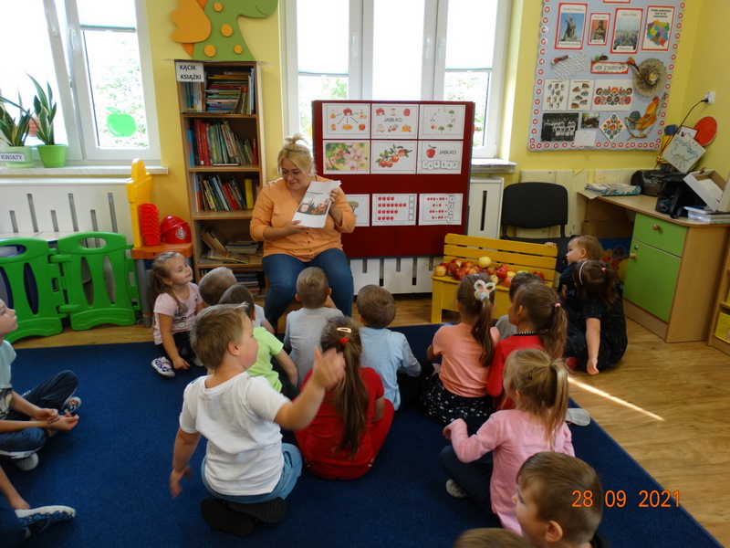28 września w naszym przedszkolu zorganizowane zostało Święto Jabłka. W tym dniu przedszkolaki poznały różne gatunki jabłek, rozpoznawały zapach i smak tych owoców oraz zdobywały wiadomości na temat potraw i przetworów z jabłek. Nasze prace plastyczne zamieniły się w kolorowe sady, na których królowały oczywiście jabłuszka. Ponadto wykonały kilka zadań matematycznych: tworzyły zbiory, przeliczały owoce, porównywały wielkość, wykonywały ćwiczenia wspomagające kształtowanie orientacji przestrzennej. Tego dnia w przedszkolnym menu oczywiście nie zabrakło soczystych jabłek. Głównym celem tego dnia było zachęcanie przedszkolaków do spożywania owoców i to pod różnymi postaciami, z powodu ich walorów odżywczych i zdrowotnych.