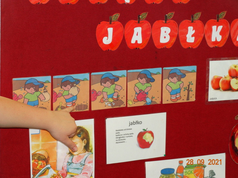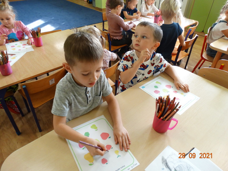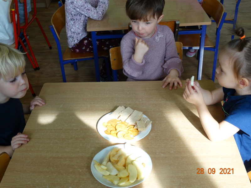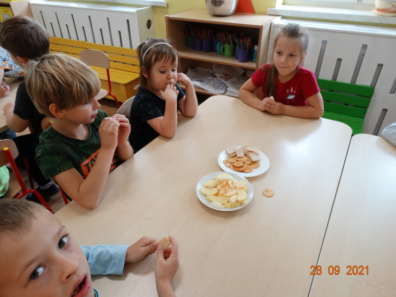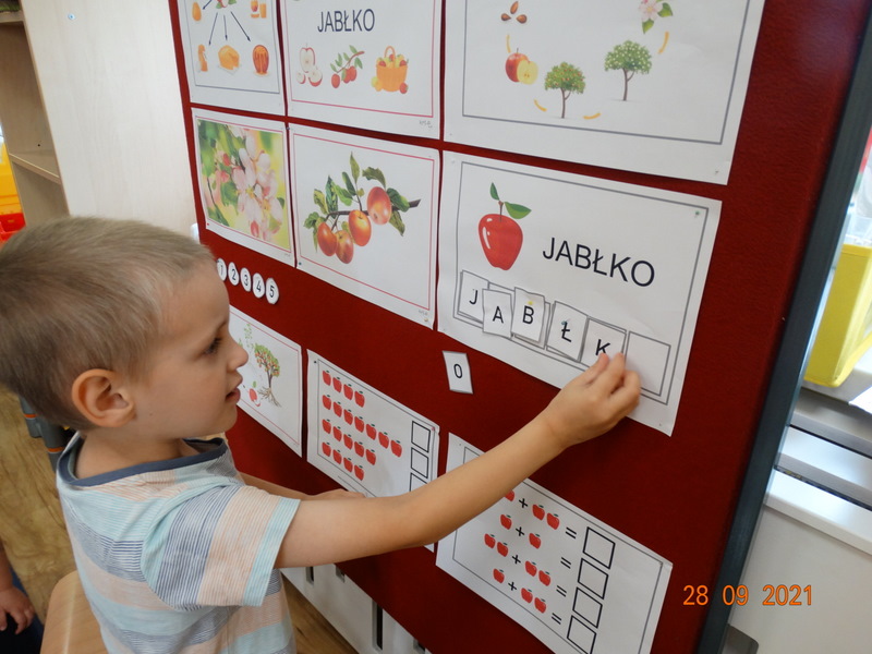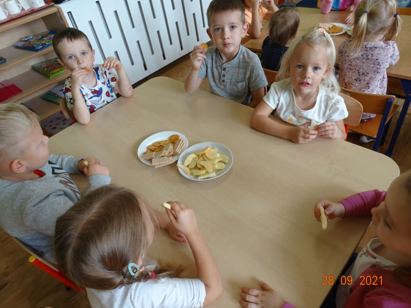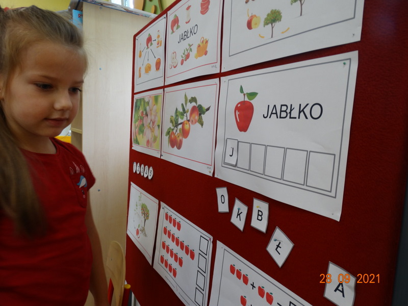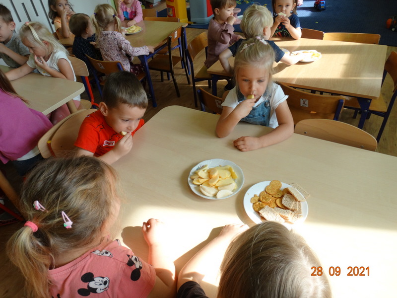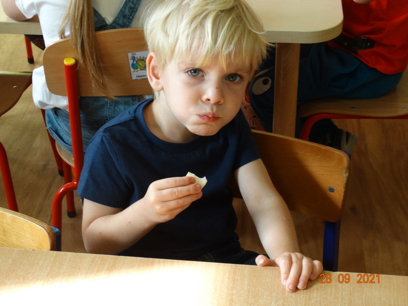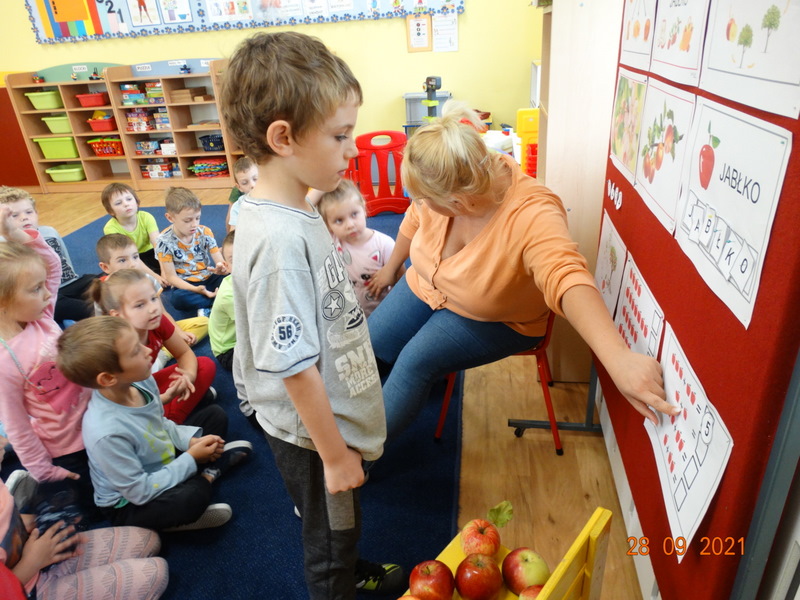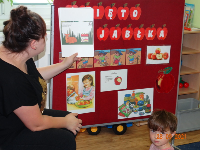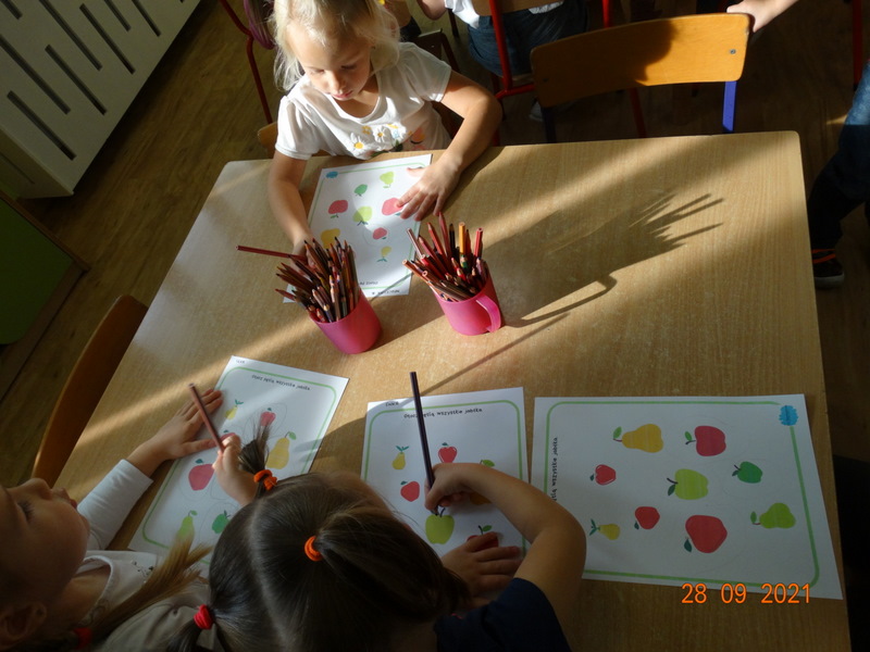 28 września w naszym przedszkolu zorganizowane zostało Święto Jabłka. W tym dniu przedszkolaki poznały różne gatunki jabłek, rozpoznawały zapach i smak tych owoców oraz zdobywały wiadomości na temat potraw i przetworów z jabłek. Nasze prace plastyczne zamieniły się w kolorowe sady, na których królowały oczywiście jabłuszka. Ponadto wykonały kilka zadań matematycznych: tworzyły zbiory, przeliczały owoce, porównywały wielkość, wykonywały ćwiczenia wspomagające kształtowanie orientacji przestrzennej. Tego dnia w przedszkolnym menu oczywiście nie zabrakło soczystych jabłek. Głównym celem tego dnia było zachęcanie przedszkolaków do spożywania owoców i to pod różnymi postaciami, z powodu ich walorów odżywczych i zdrowotnych.