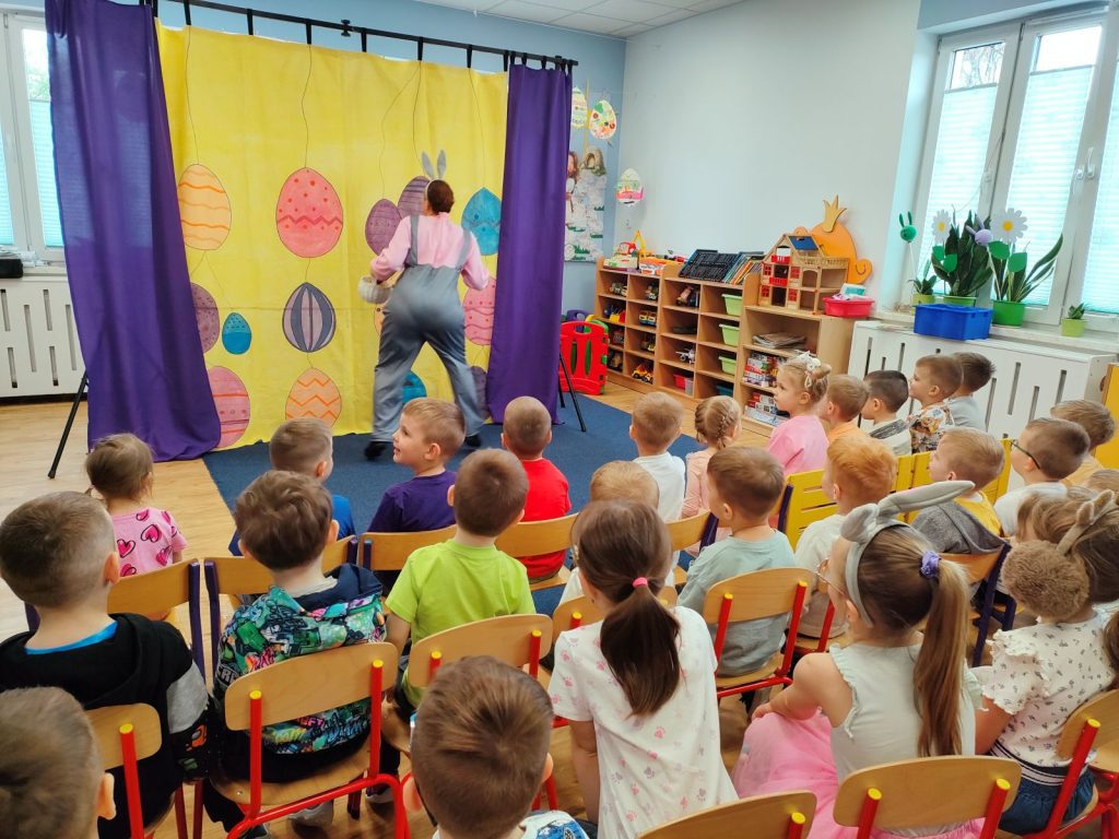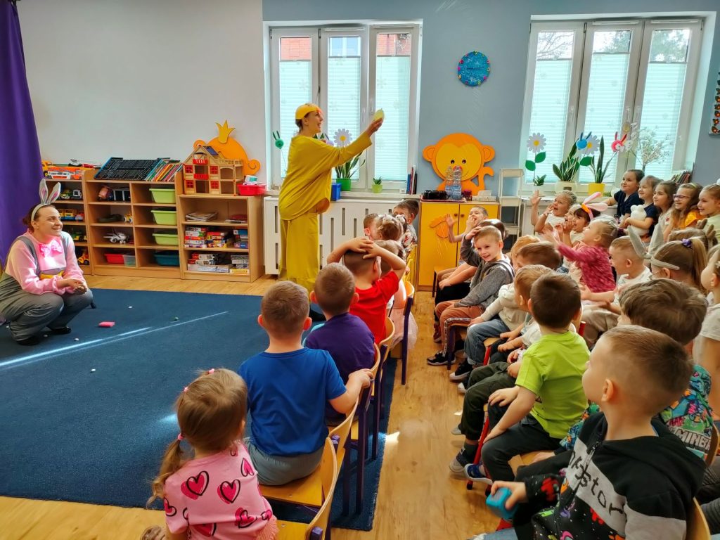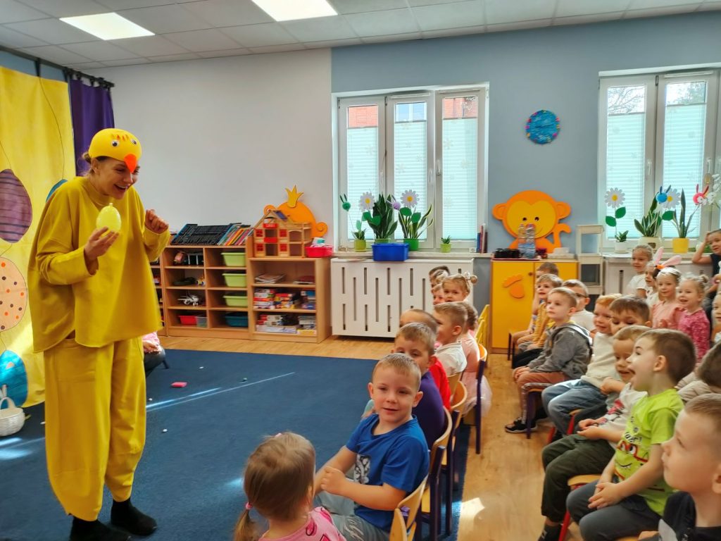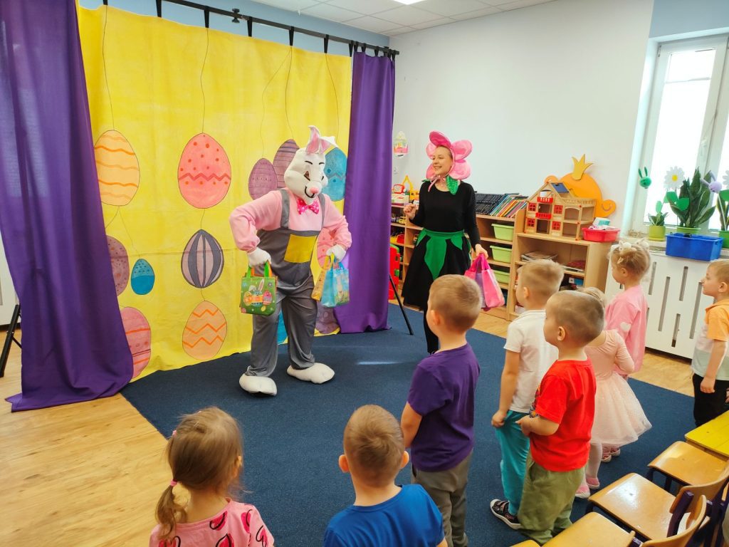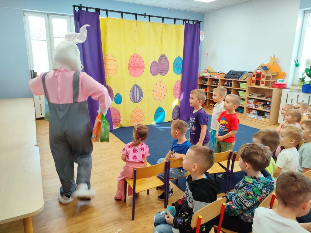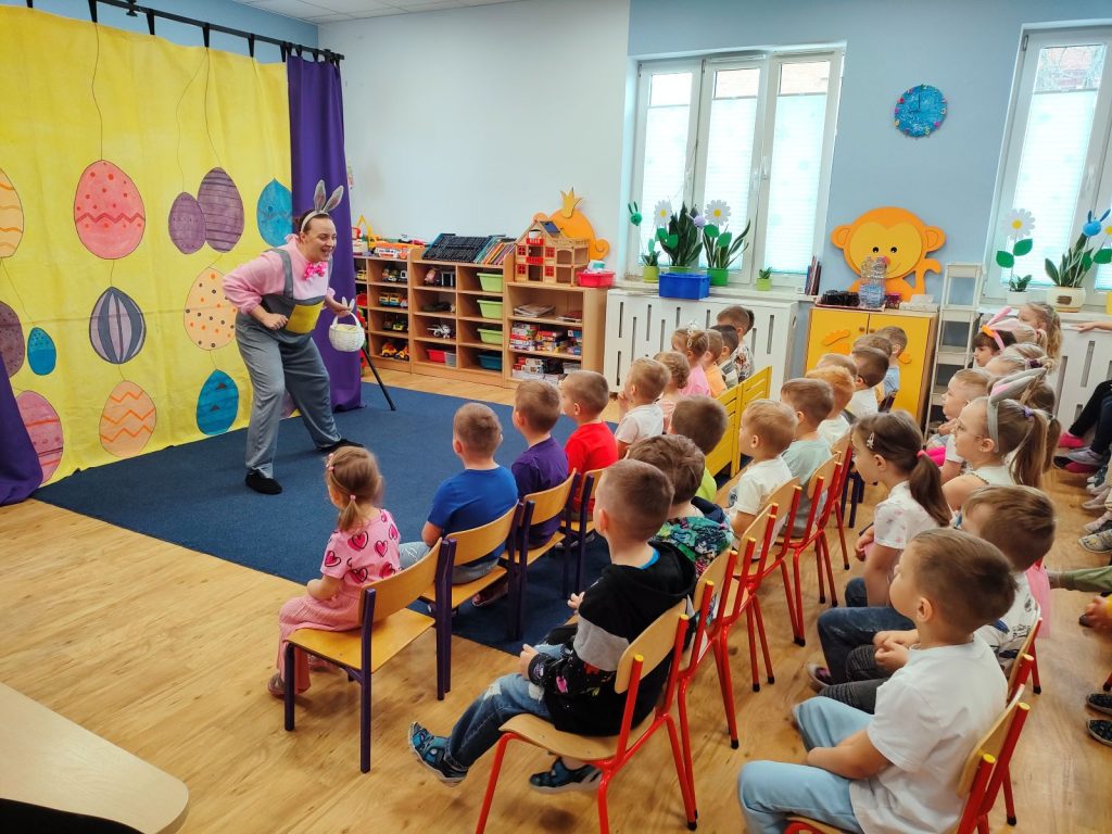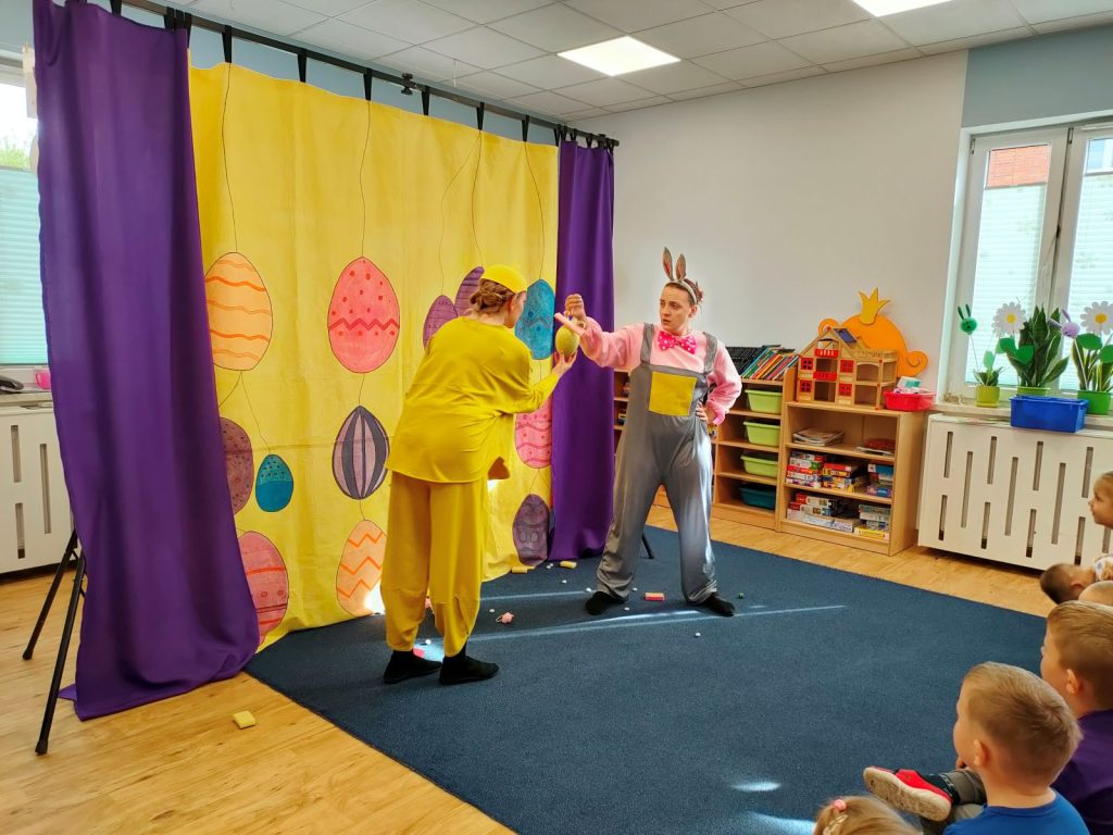 W dniu dzisiejszym mieliśmy przyjemność gościć Teatr Dwóch, który zaprezentował nam wspaniałe, ciekawe i pouczające przedstawienie pt. „Wielkanocna niespodzianka”. Podczas spektaklu nie zabrakło aktywności, które wciągnęły zarówno dzieci, jak i dorosłych. Aktorzy zadbali o to, by publiczność była nie tylko widzami, ale również uczestnikami wydarzeń na scenie. Dzięki temu wszyscy mieli okazję do wspólnej zabawy, śmiechu oraz nauki. Po przedstawieniu odwiedził nas długo oczekiwany gość – zajączek wielkanocny. 🐰Przybył do nas z koszykiem pełnym małych, ale niezwykle uroczych prezencików, które sprawiły radość każdemu z obecnych. Zajączek okazał się być nie tylko dostawcą prezentów, ale także wspaniałym kompanem do zabawy. Dzieci dowiedziały się więcej o tradycjach wielkanocnych, a także miały możliwość aktywnego uczestnictwa w przedstawieniu, co z pewnością wzbogaciło ich doświadczenie i wiedzę.☀️🌷
