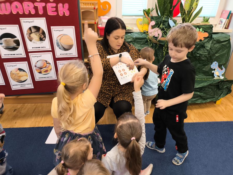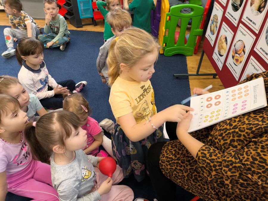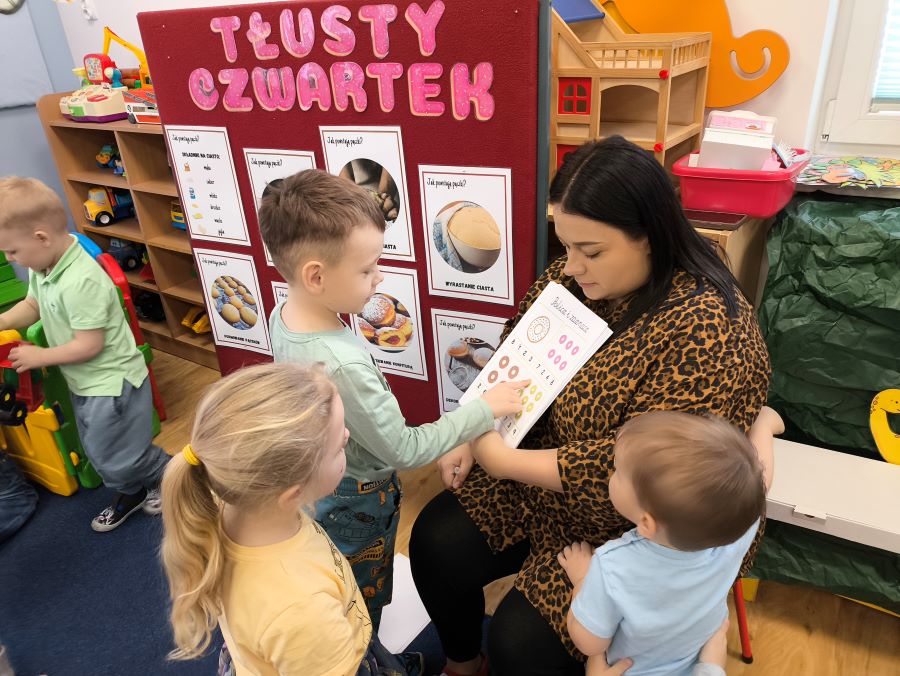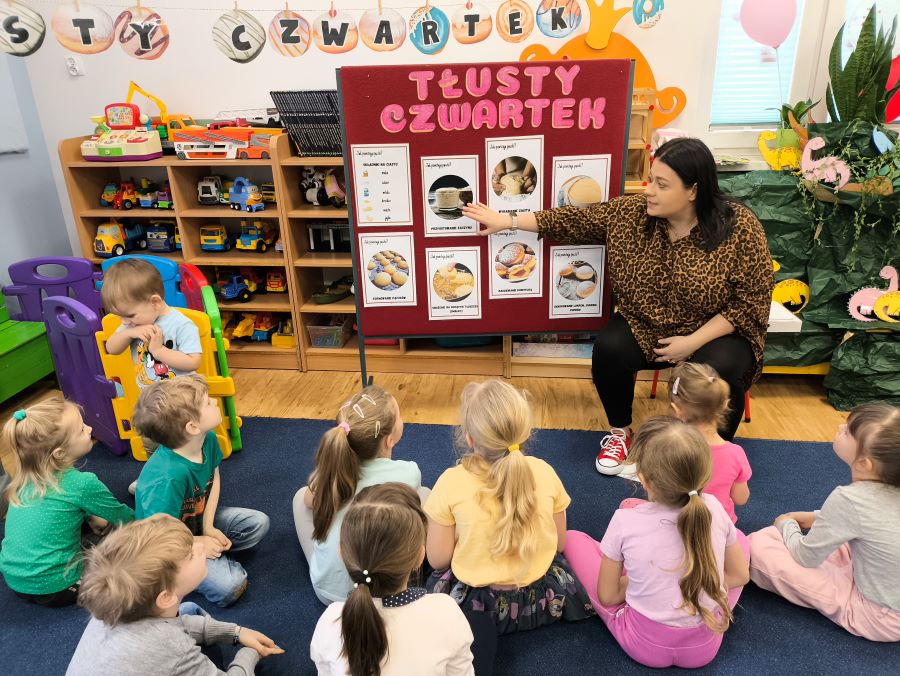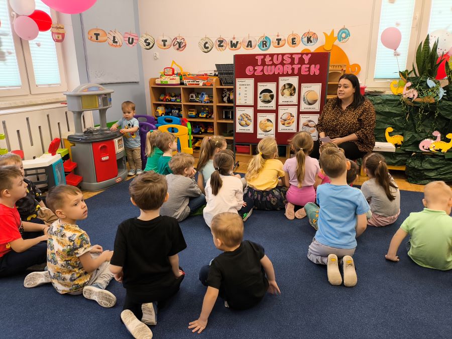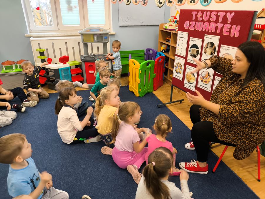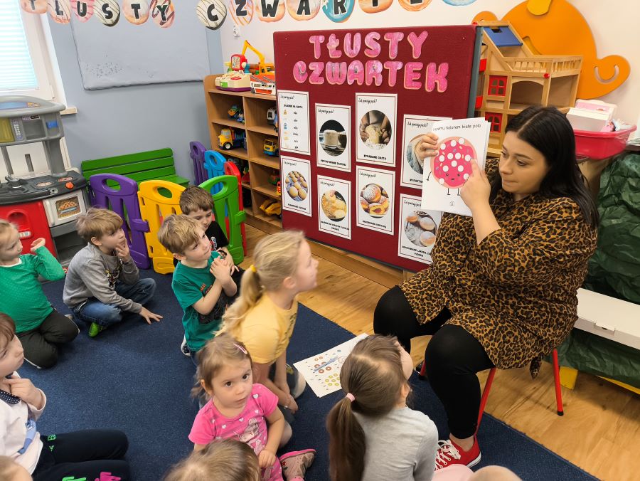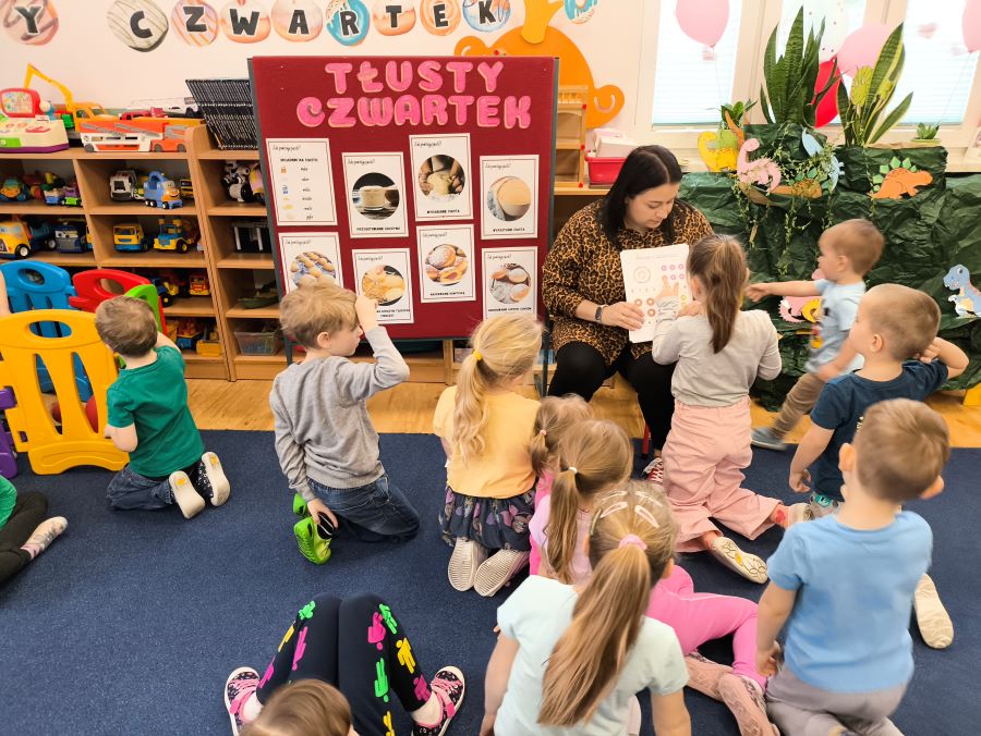Tłusty Czwartek to dzień, na który czekają nie tylko dorośli – nasze przedszkolaki również świętowały ten słodki dzień! Na początku dzieci poznały historię Tłustego Czwartku – skąd się wzięło to święto i dlaczego w tym dniu królują pączki. Nie zabrakło ciekawostek i śmiechu, gdy wspólnie zastanawialiśmy się, ile pączków można zjeść w jeden dzień! 😉