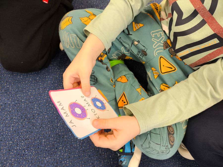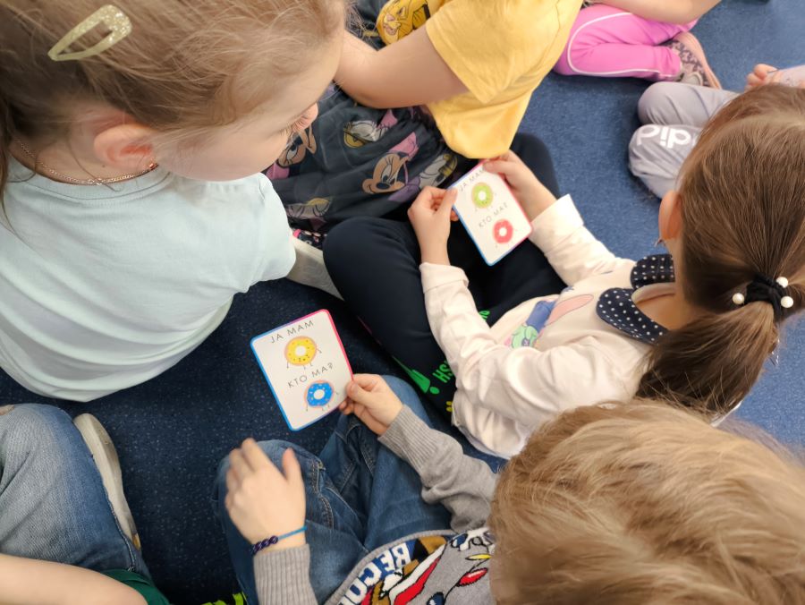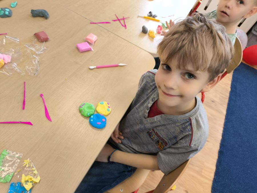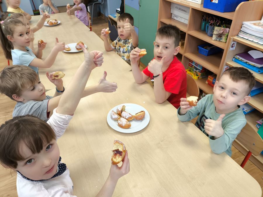 Nie mogło zabraknąć oczywiście degustacji prawdziwych pączków – każdy z wielką radością zajadał ten tradycyjny przysmak. Na koniec dzieci lepiły pączki z piankoliny według własnych pomysłów – z lukrem, posypką, a nawet nadzieniem!