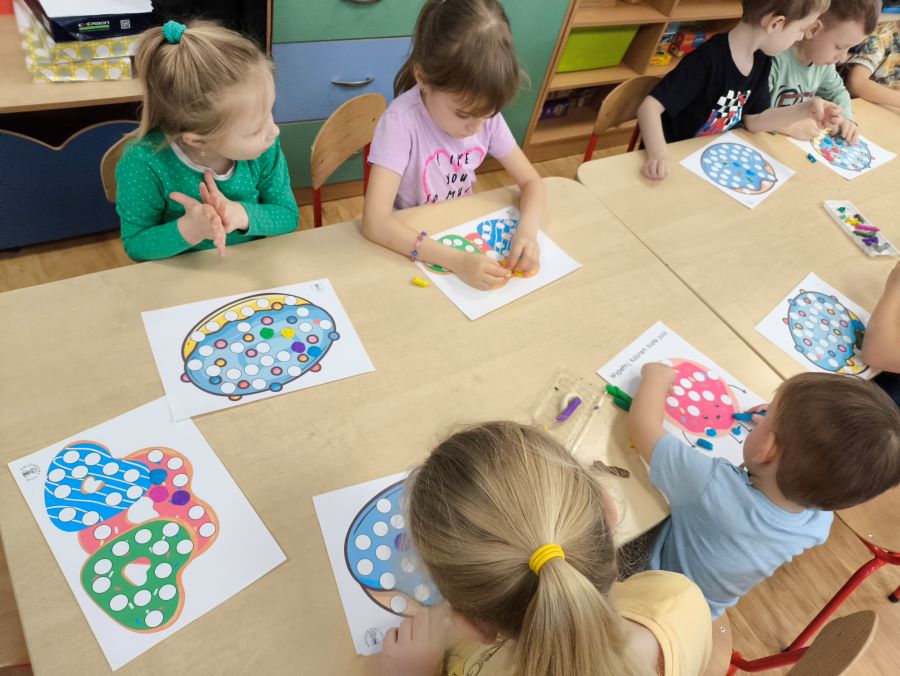 Następnie przyszedł czas na zajęcia plastyczne – dzieci uzupełniały brakujące kropeczki na obrazkach, wykorzystując do tego plastelinę. Zabawa była nie tylko kreatywna, ale i doskonale rozwijała motorykę małą.