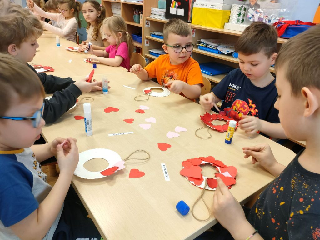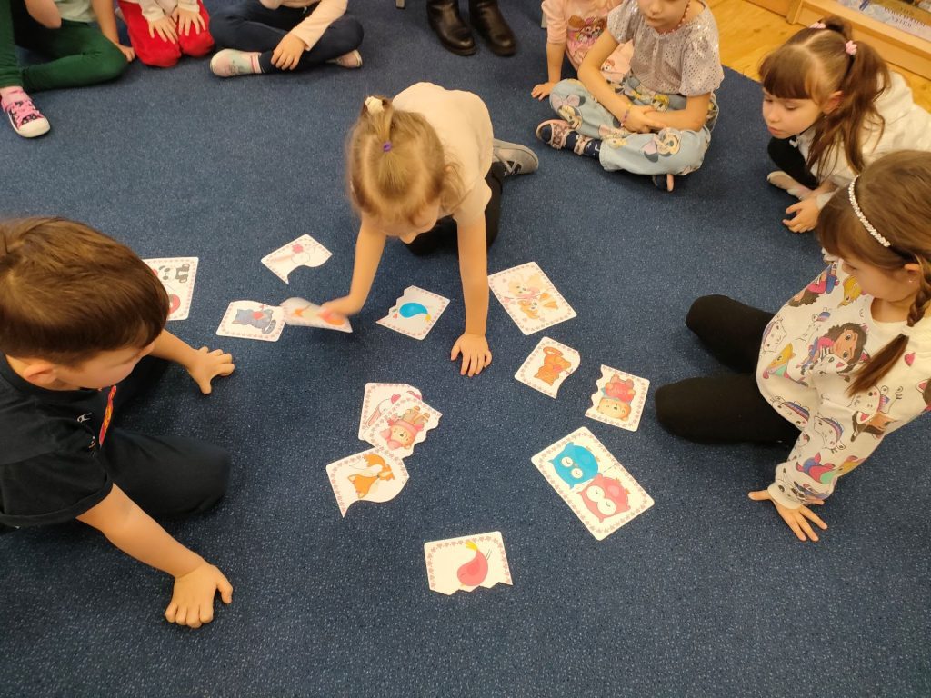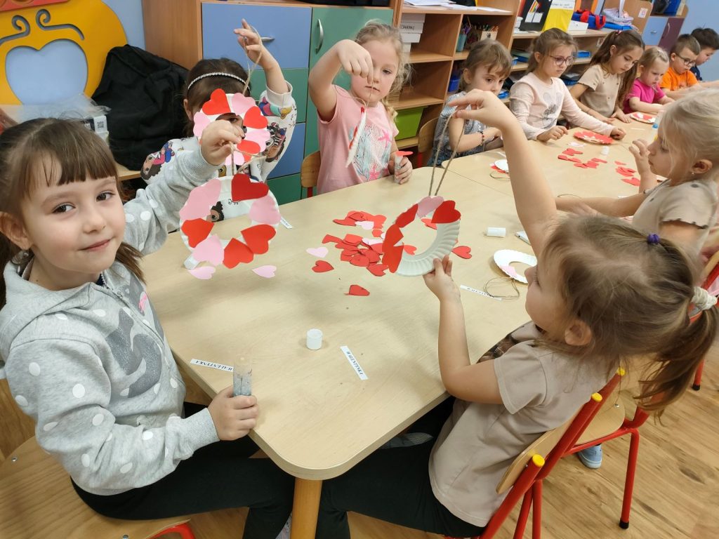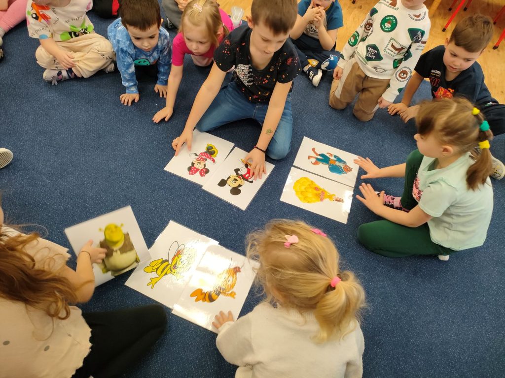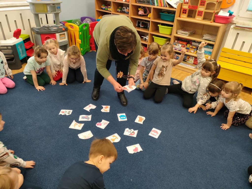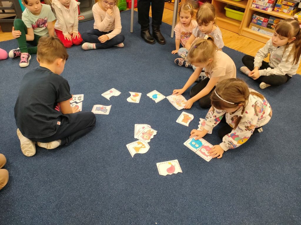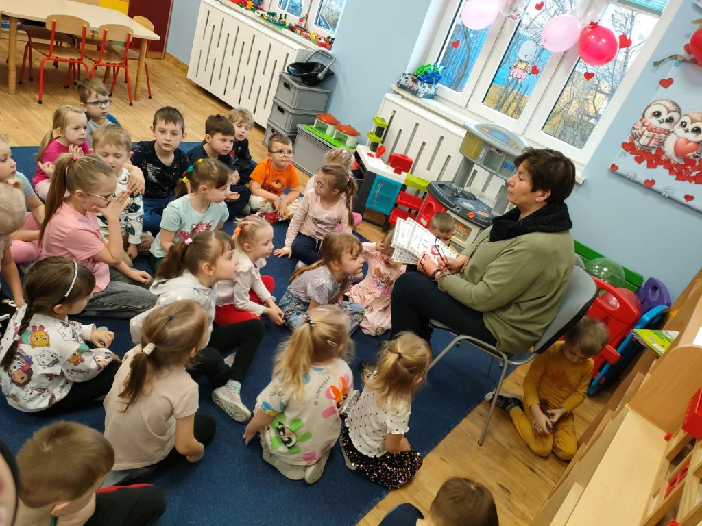 Dnia dzisiejszego, jak co środę, odwiedziła nas Pani Iwonka. Jest to zawsze wyjątkowy czas, kiedy możemy posłuchać ciekawych opowieści i zanurzyć się w świecie bajek. Tym razem, z okazji Walentynek, Pani Iwonka przygotowała dla nas dwie szczególne historie. Pierwszą bajką, którą usłyszeliśmy, była opowieść o Franklinie i walentynkach. Ta historia pokazała nam, jak ważne jest okazywanie uczuć i troski swoim przyjaciołom oraz rodzinie. Następnie Pani Iwonka przeczytała nam bajkę zatytułowaną „Felek i miłość – emocje”. Ta historia pozwoliła nam lepiej zrozumieć różne emocje, które towarzyszą miłości i przyjaźni. Po bajkach nadszedł czas na zabawy. Usiedliśmy w kole na dywanie i Pani Iwonka zaproponowała nam grę w dopasowywanie postaci z bajek do ich połówek. Było przy tym mnóstwo śmiechu i radości, a każdy z nas miał okazję wykazać się spostrzegawczością i pamięcią. Na zakończenie tego pełnego emocji i wrażeń dnia, przystąpiliśmy do wykonywania pięknych walentynek. Z kolorowych papierowych serduszek stworzyliśmy kartki, które później mogliśmy podarować naszym bliskim. Każda walentynka była wyjątkowa i niepowtarzalna, pełna dziecięcej fantazji i kreatywności. ❤️❤️