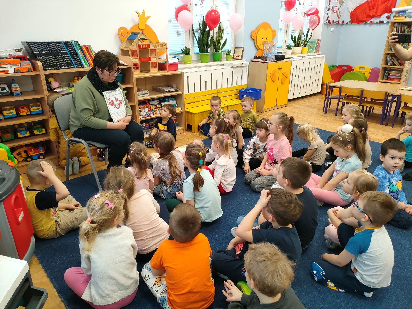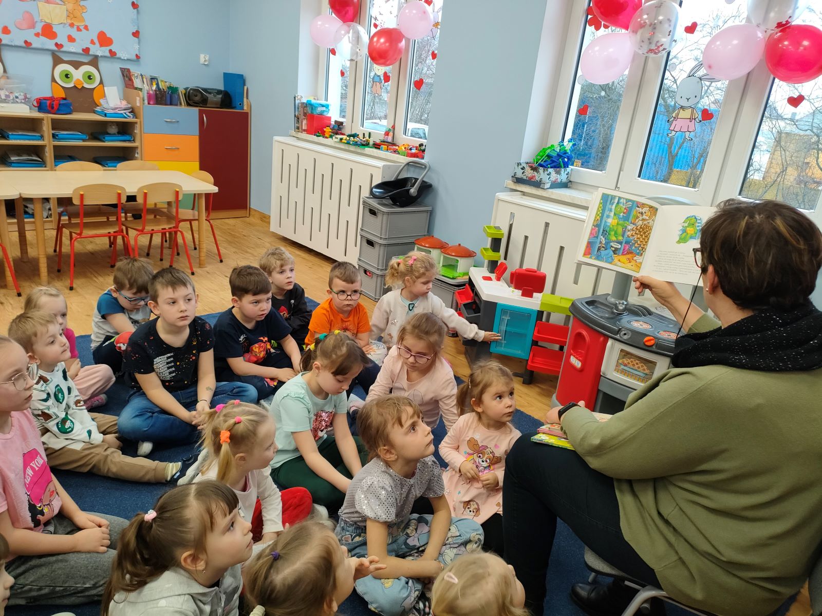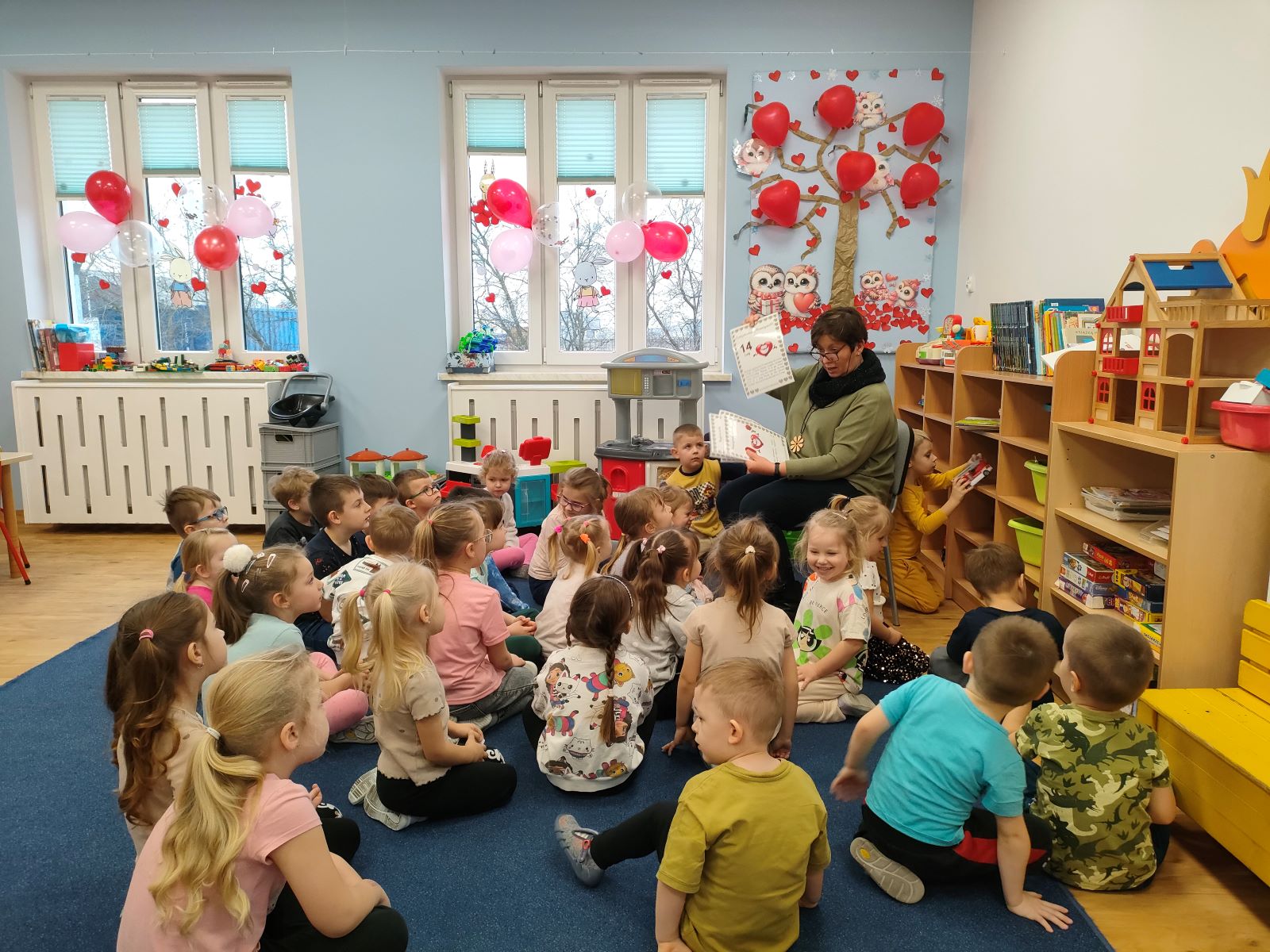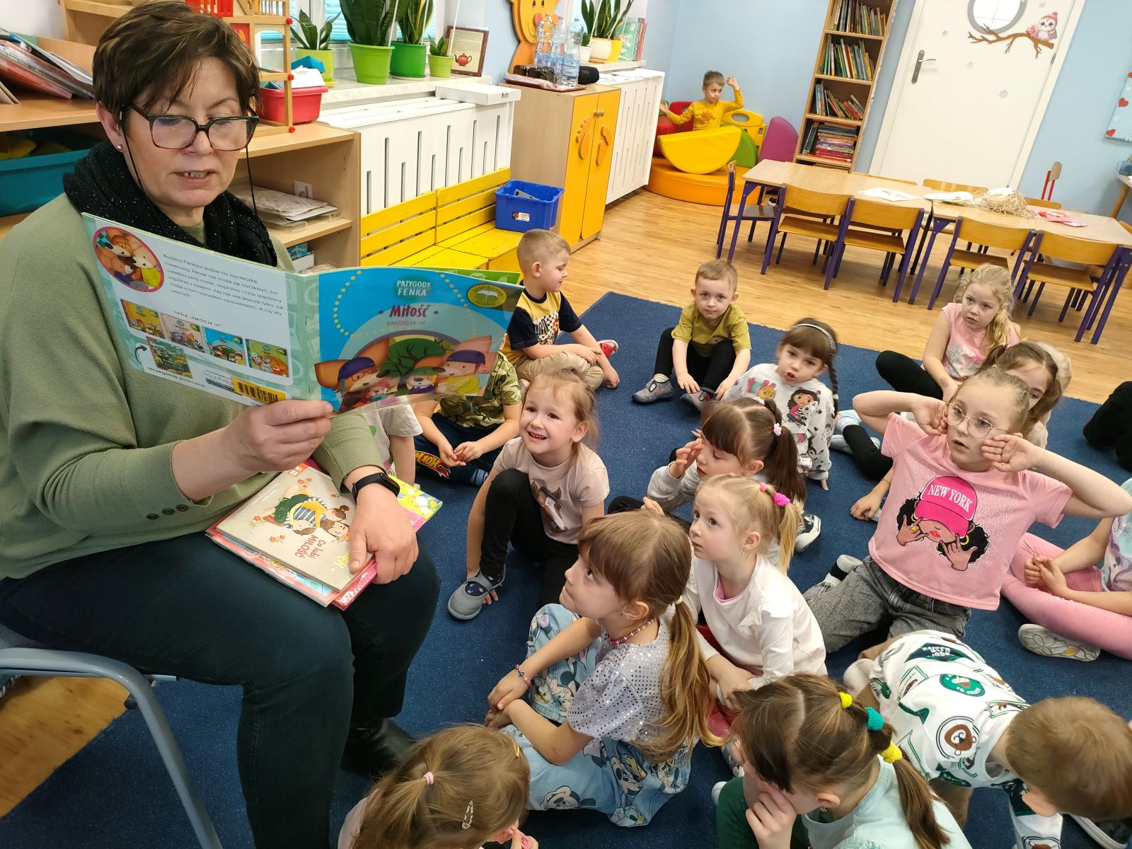 Dnia dzisiejszego, jak co środę, odwiedziła nas Pani Iwonka. Jest to zawsze wyjątkowy czas, kiedy możemy posłuchać ciekawych opowieści i zanurzyć się w świecie bajek. Tym razem, z okazji Walentynek, Pani Iwonka przygotowała dla nas dwie szczególne historie. Pierwszą bajką, którą usłyszeliśmy, była opowieść o Franklinie i walentynkach. Ta historia pokazała nam, jak ważne jest okazywanie uczuć i troski swoim przyjaciołom oraz rodzinie. Następnie Pani Iwonka przeczytała nam bajkę zatytułowaną „Felek i miłość – emocje”. Ta historia pozwoliła nam lepiej zrozumieć różne emocje, które towarzyszą miłości i przyjaźni. Po bajkach nadszedł czas na zabawy. Usiedliśmy w kole na dywanie i Pani Iwonka zaproponowała nam grę w dopasowywanie postaci z bajek do ich połówek. Było przy tym mnóstwo śmiechu i radości, a każdy z nas miał okazję wykazać się spostrzegawczością i pamięcią. Na zakończenie tego pełnego emocji i wrażeń dnia, przystąpiliśmy do wykonywania pięknych walentynek. Z kolorowych papierowych serduszek stworzyliśmy kartki, które później mogliśmy podarować naszym bliskim. Każda walentynka była wyjątkowa i niepowtarzalna, pełna dziecięcej fantazji i kreatywności. ❤️❤️